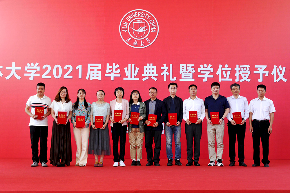 毕业典礼在雄壮肃穆的国歌声中拉开序幕。会上,副院长随阳轶教授和刘长胜教授分别宣读了2021届毕业生博士、硕士及学士学位授予决定,随后主礼教授嵇艳鞠院长、随阳轶院长为毕业生拨动流苏、授予学位。学位授予仪式后,党委书记邱增凯教授宣读了《关于表彰吉林大学2021届优秀毕业生的决定》并为优秀毕业生颁发荣誉证书,鼓励毕业生们继续努力、再创佳绩。为提高毕业设计质量,提升人才培养水平,学院对获评优秀毕业论文的学生及指导教师进行了表彰,学院还为2017级优秀班导师颁发了荣誉证书,对他们的辛勤付出给予了肯定和感谢。