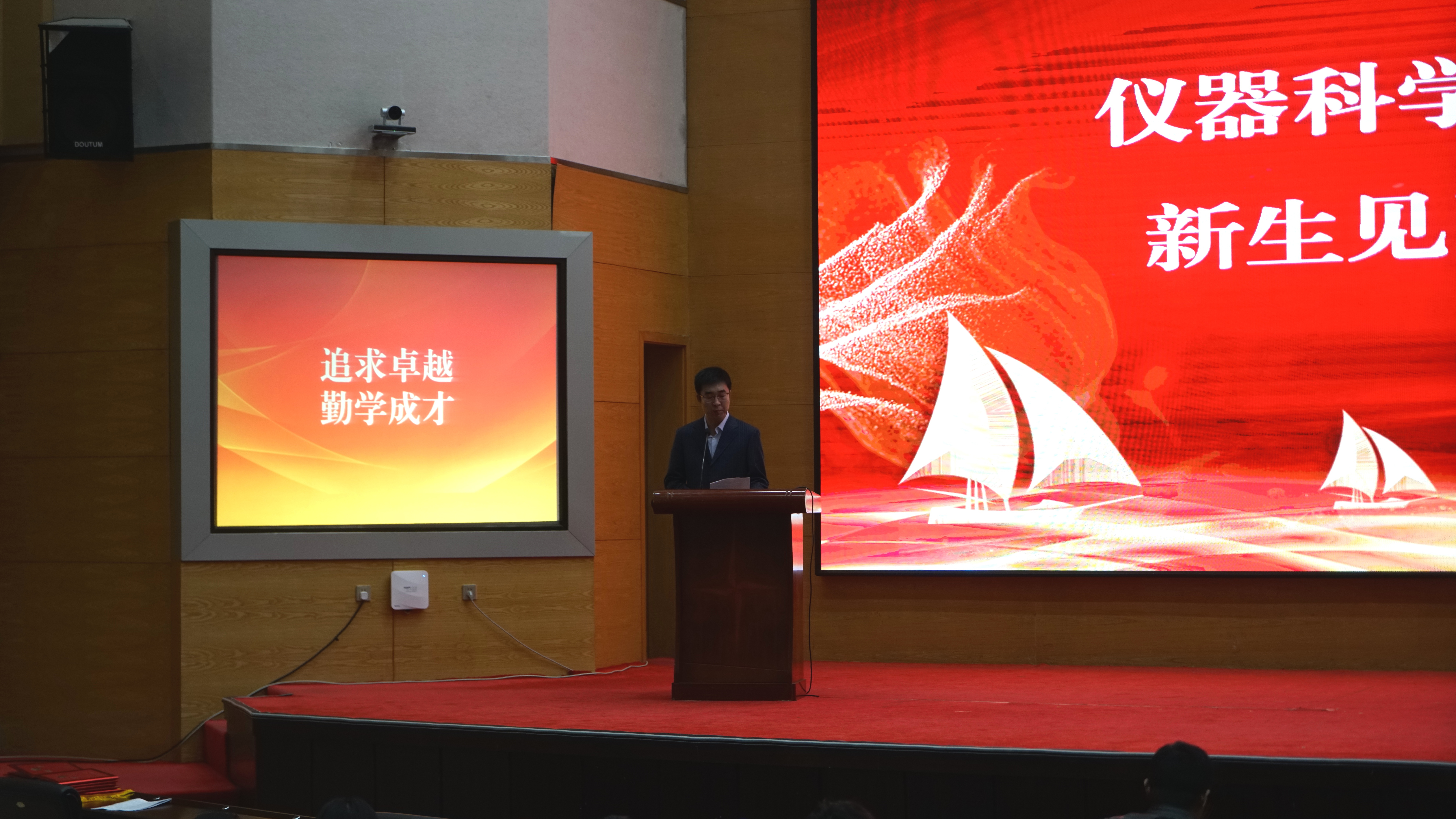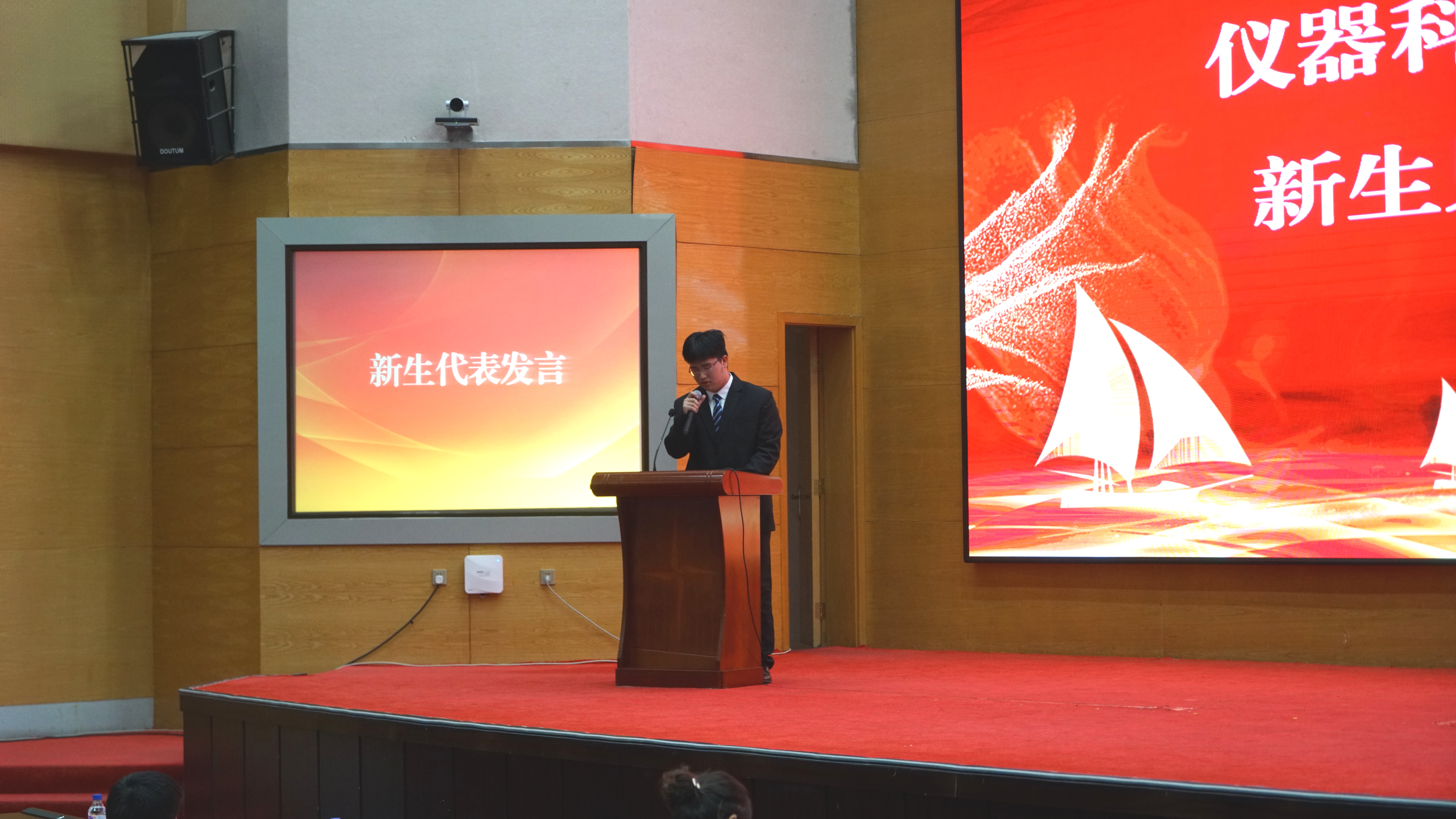 关于任聘2021级新生班导师的决定》,党委书记邱增凯为班导师颁发聘书并合影留念。随后,范祺伟同学代表新生发言,他代表全体新同学郑重承诺要积极进取,励志图强,认真对待大学生活。之后,副院长刘长胜老师为同学们介绍学院整体情况,他从学院总体布局出发,介绍了我院科研平台,本科、研究生等方面的建设状况,同时详细介绍了我院专业发展历程和现状、学科排名及未来发展方向等,并表示在仪电学院的广阔天地,新同学们一定能大有作为。