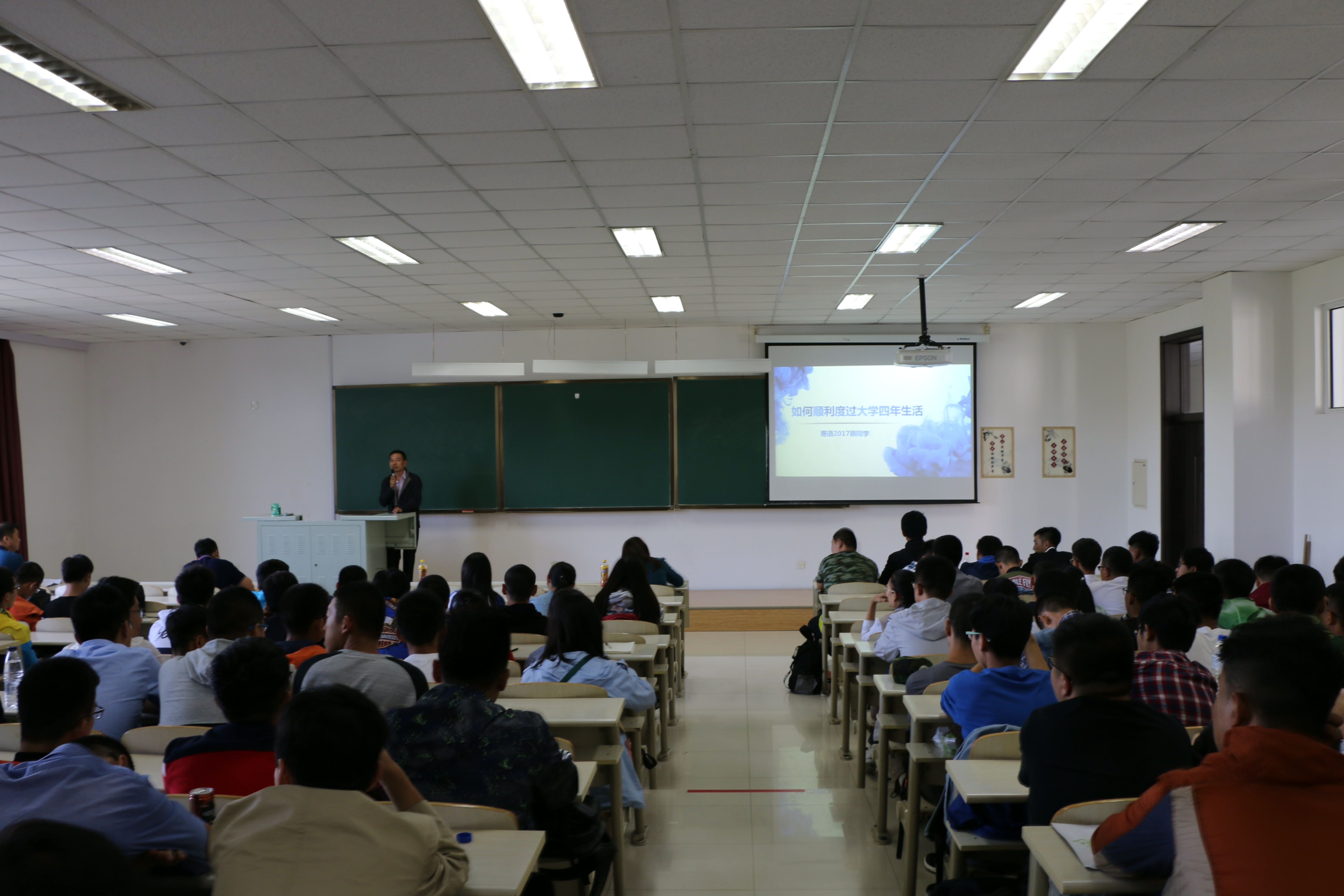 党委书记王爱民以“如何顺利度过大学四年生活”为主题为2017级新生进行了一场生动的讲座,讲座于我校前卫南区李四光楼104室举行。