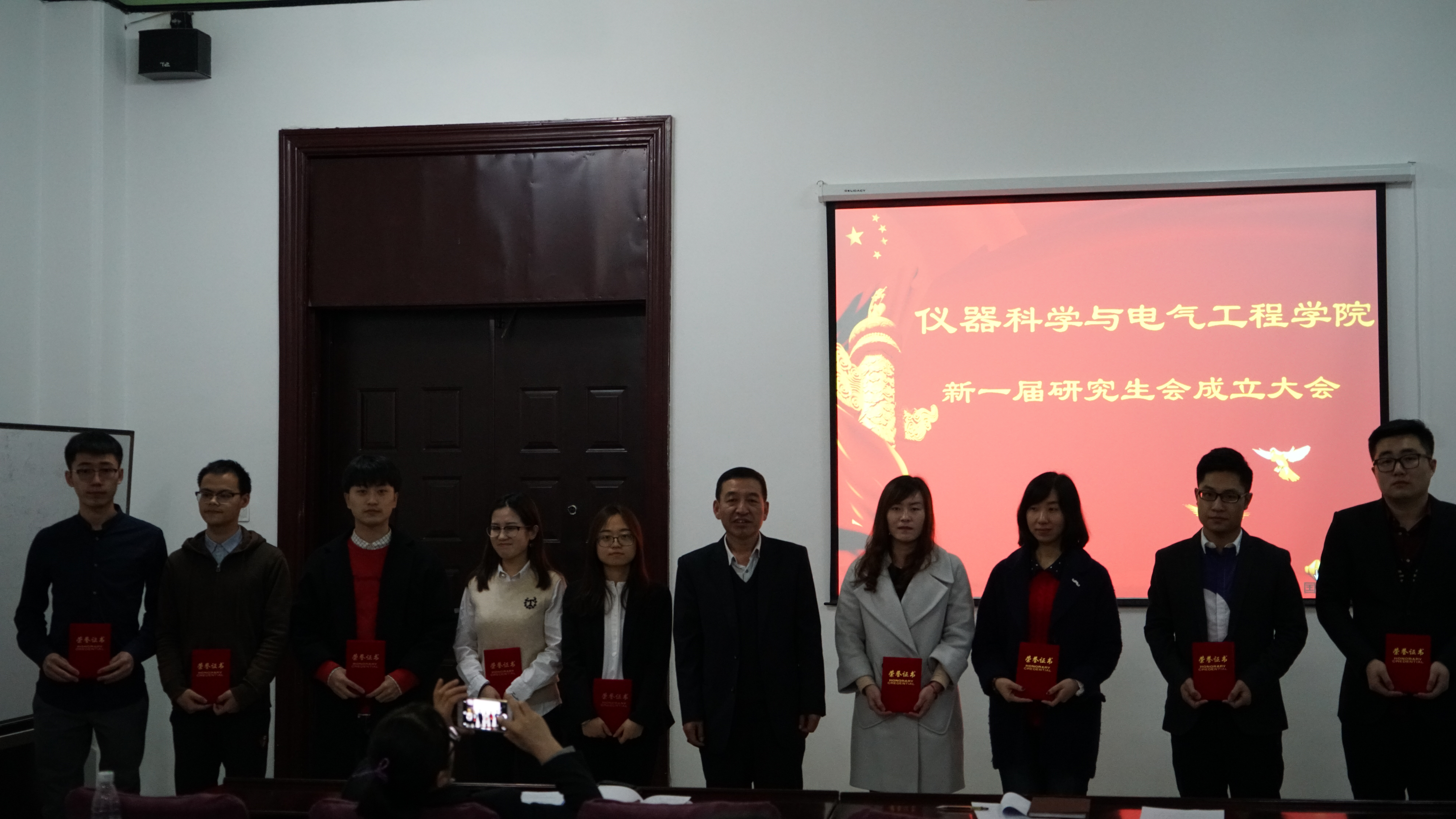 研究生会章程》,章程从研究生会总体性质,会员要求,会员权利,部门构成及职责,主席团构成及职责,研究生会规章制度等几个方面出发,系统全面的为全体与会成员介绍了研究生会的基本情况,明确了研究生会在我院研究生工作开展中的重要性、崇高性与关键性。随后,副院长嵇艳鞠教授宣读新一届研究生会主席团成员名单,其中,任命黄维宁同学为研究生会主席,韩哲鑫同学为研究生会常务副主席。宣读完毕,嵇院长对成功当选的九位学生干部表示热烈祝贺并简单表达了自己对研究生会工作的深切期望。在王爱民老师为九位主席团成员颁发聘书后,黄维宁同学作为主席团成员代表上台讲话。话语中既有对组织信任委以要职的感恩之情,又有代表全体研究生会成员坚定锐意进取,埋头苦干品质的壮志之心,他从制度建设和活动筹划两个角度展望了今后工作,并提出了“完善自我,树立标杆”的工作追求,为研究生会工作绘制了宏伟蓝图。