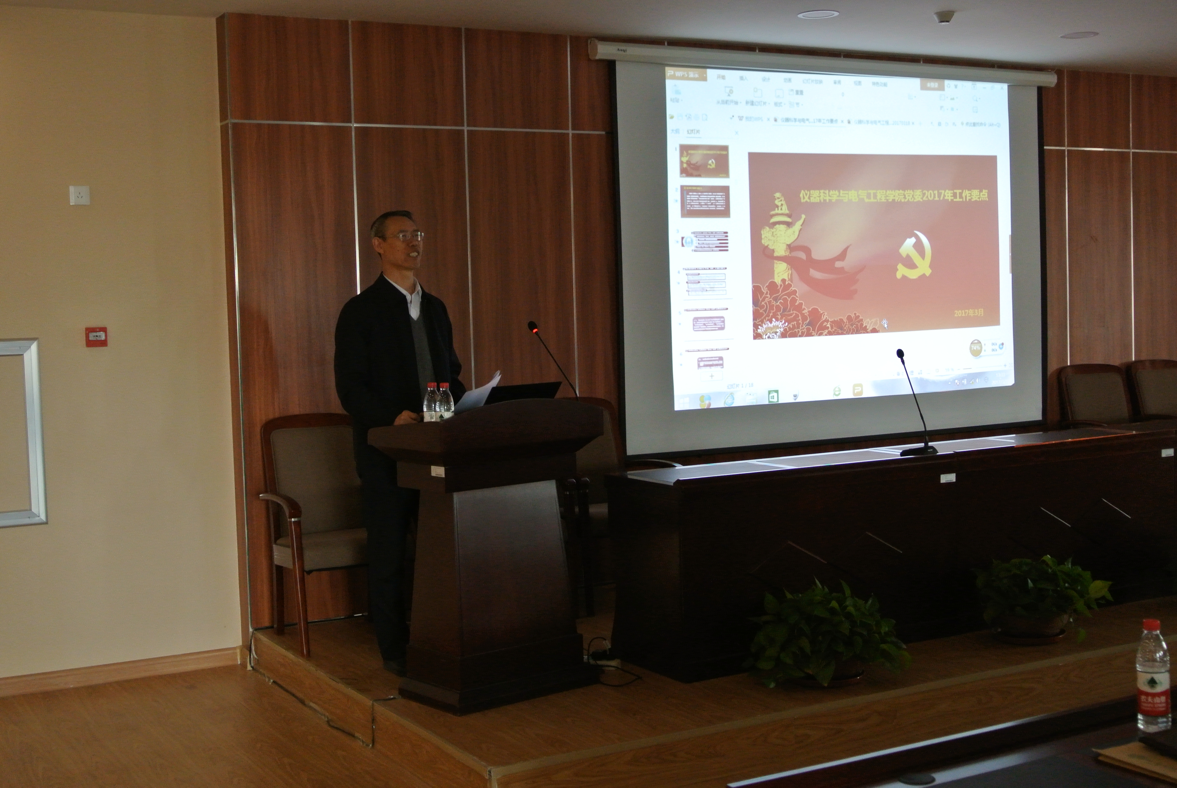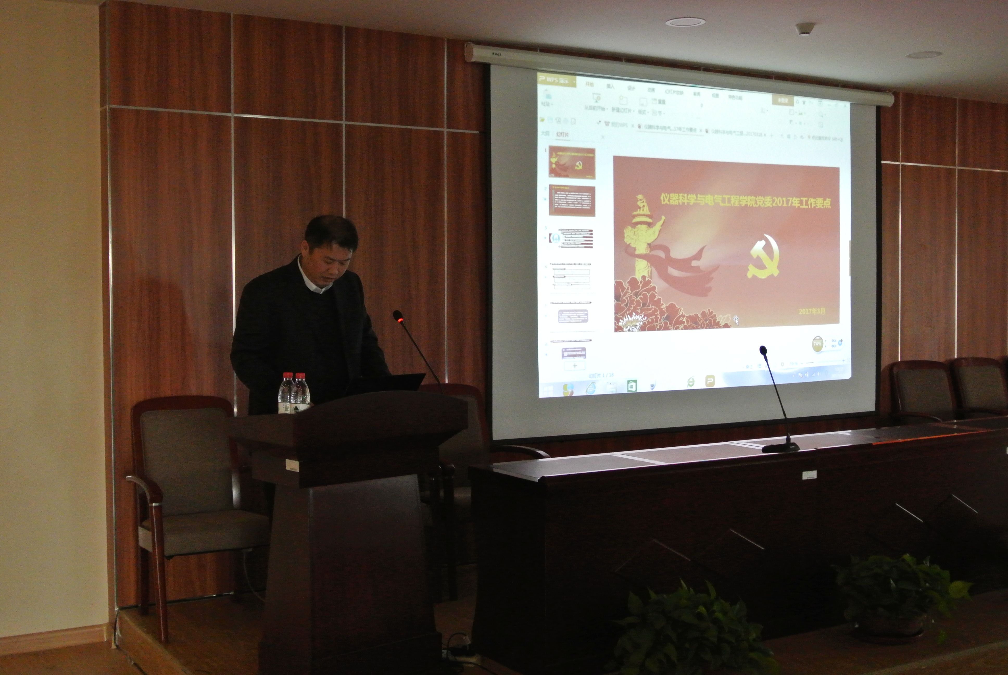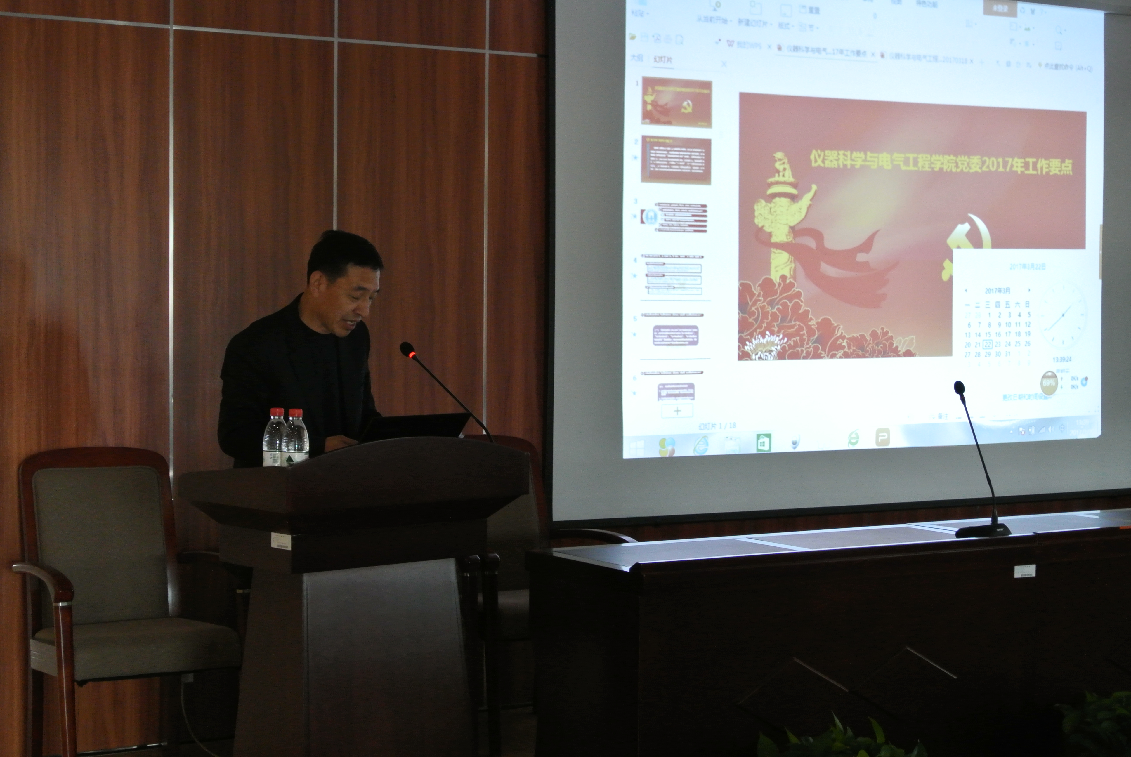 党委书记王爱民结合学院贯彻落实全国高校思想政治工作会议精神和《吉林大学关于加强和改进新形势下基层党建工作若干规定(试行)》、《吉林大学关于加强和改进新形势下教职工思想政治工作的实施方案》、《吉林大学关于加强和改进新形势下本科学生思想政治工作的实施方案》、《吉林大学关于加强和改进新形势下研究生思想政治工作的实施方案》精神,从加强领导班子建设,强化党委主体责任;以党员先锋工程为抓手,加强基层党建工作;加强宣传工作,切实加强意识形态阵地建设 ;多措并举,做好新形势下学生思想政治教育工作;抓好群众、群团、统战工作,建设和谐学院;从严从实抓好党风廉政建设和反腐败工作,建设清朗学院等六个方面全面布置了学院党委2017年工作。