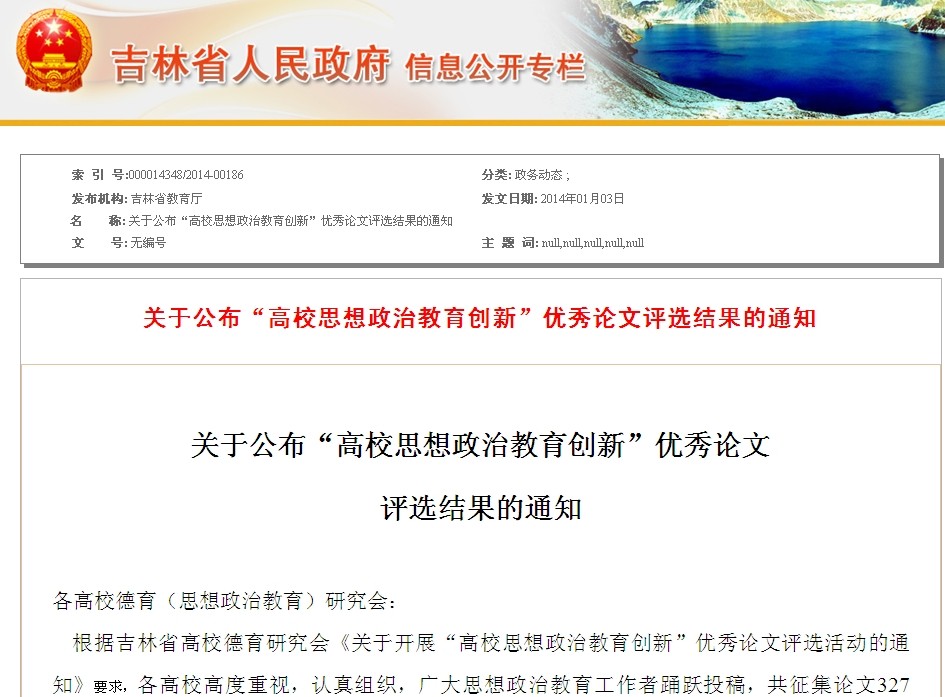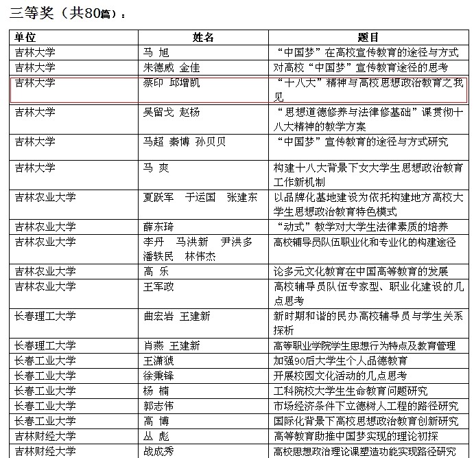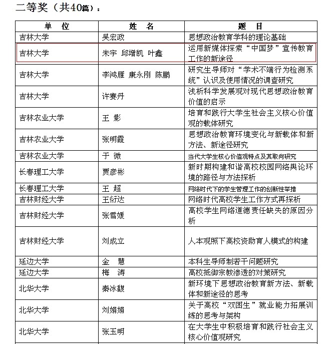 为深入学习贯彻党的十八大精神,进一步加强和改进大学生思想政治教育,推进思想政治教育学科建设与实践创新,全面提升我校思想政治教育质量,吉林省教育厅、吉林省高校德育研究会联合举办了全省“高校思想政治教育创新”优秀论文评选活动。