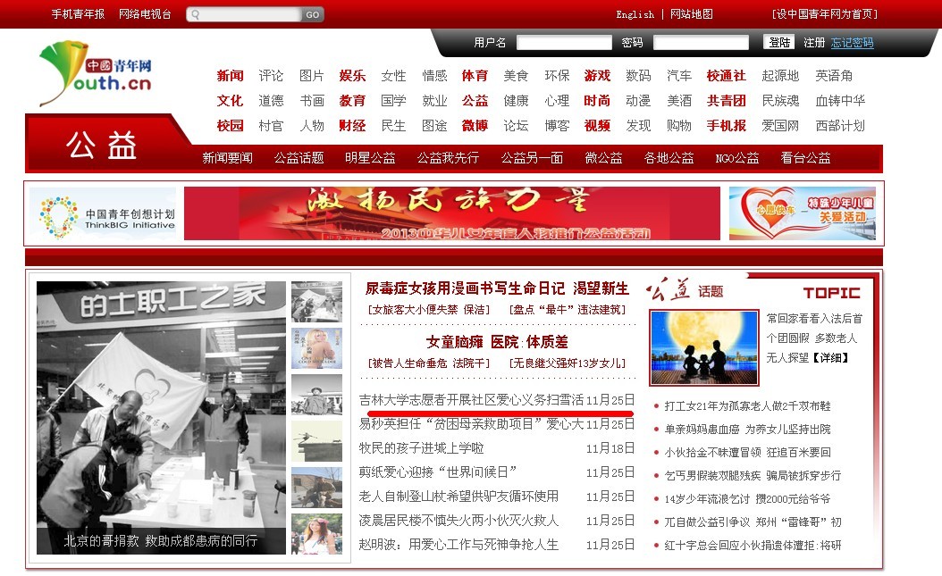 中国青年网《吉林大学志愿者开展社区爱心义务扫雪活动》