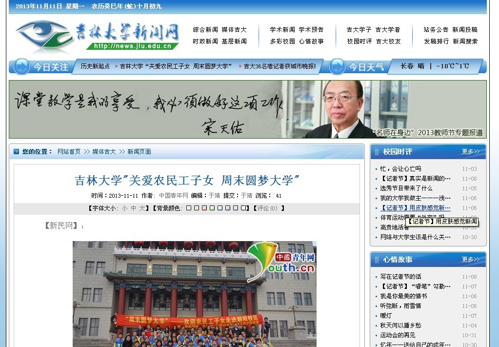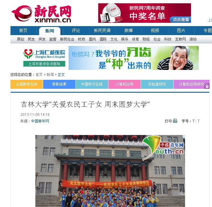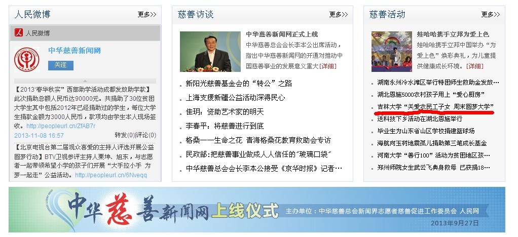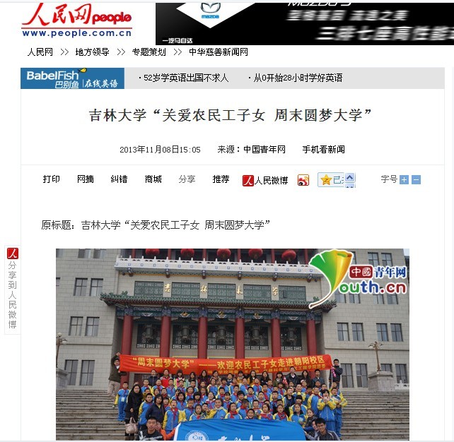 1、人民网 全文转载《吉林大学“关爱农民工子女周末圆梦大学” 》