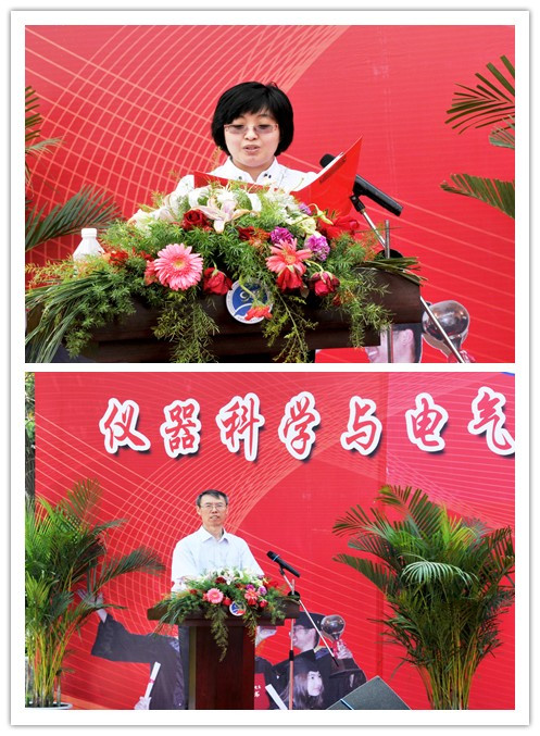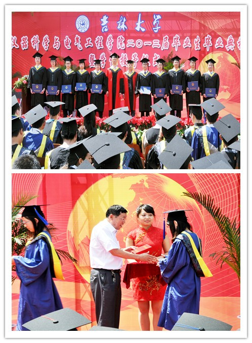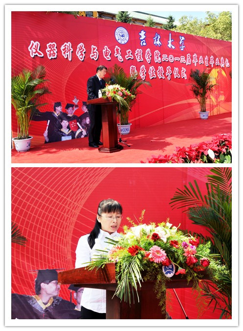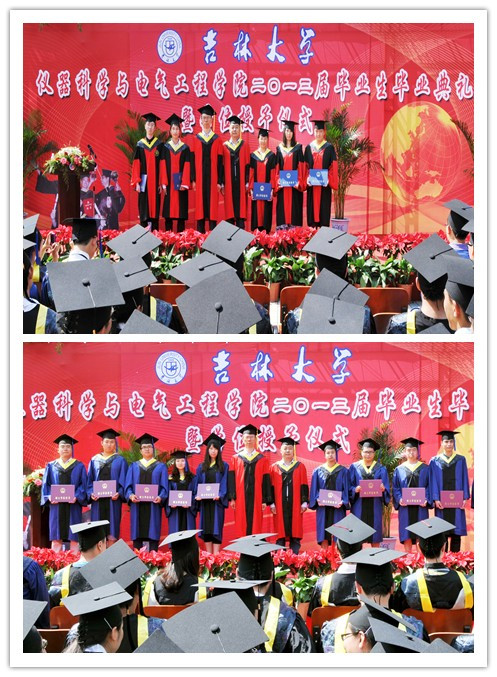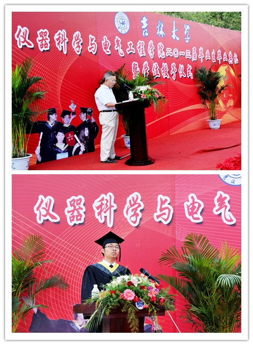 2013届研究生毕业生和本科毕业生名单,院长林君教授与院学位委员会主任田地教授一起为2013届毕业生授予学位。随后,院党委书记余国友教授宣读了2013届校、院优秀毕业生名单,并为优秀毕业生颁发获奖证书、合影留念。学院教学委员会主任王应吉教授宣读了优秀毕业论文名单,仪器系主任凌振宝教授、电气系主任刘长胜副教授分别为获得优秀毕业论文的同学颁发证书并合影留念。之后,教师代表朱凯光教授和2013届毕业生代表、吉林大学2012年度十佳大学生王春泽同学分别作了发言。朱凯光教授代表学院全体教师对2013届毕业生送上了最诚挚的祝福,希望大家在今后的事业中取得更大的成就。王春泽同学代表学院全体毕业生向辛勤培养自己的母校,向仪电学院,向四年以来关心、帮助大家的领导和老师们表示了衷心的感谢和良好的祝愿。