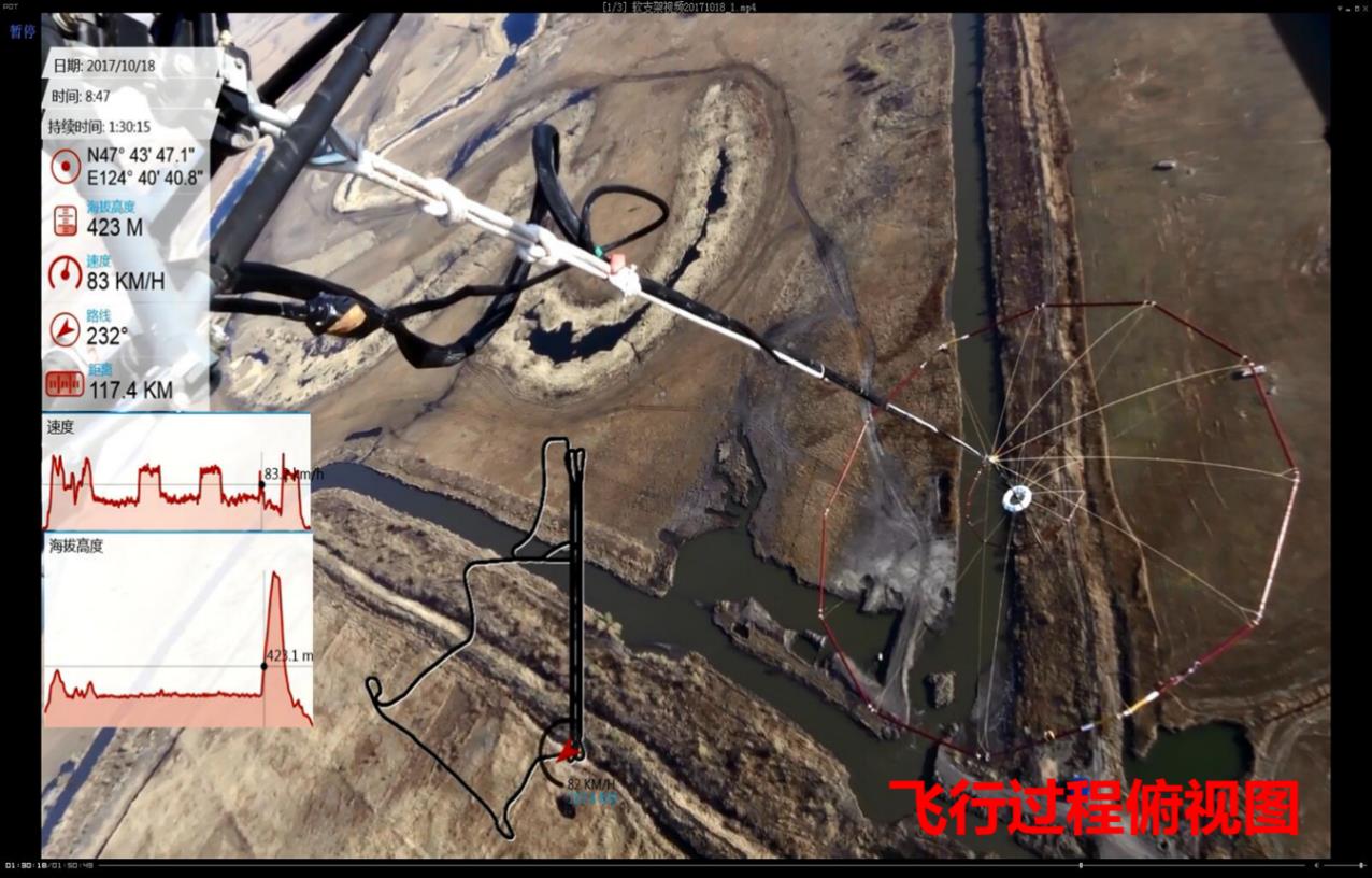 这次成功飞行,标志着我院在直升机航空电磁探测系统中的核心技术方面取得新的重大突破,包括大尺寸软支架吊舱研制、大电流高效发射机研制、大有效面积传感器研制、高精度数据收录系统研制、地面远程监测控制系统研制以及附属的一次场自抵消装置等。系统实现的关键技术指标包括:吊舱直径24米、发射磁矩800000Am2、45节飞行时动态噪声小于±1nT/s、数据采样率192kHz、远程地面控制距离100km。系统整体工作稳定可靠,可实现机上无人操控、长时间、远距离测线飞行,单架次测区覆盖40平方公里以上。