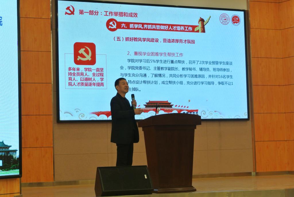 学院党委书记王爱民作总结发言,他首先从工作举措和成效、存在问题、下一步改进措施3方面对学院2017年党建工作进行了总结。随后对2018年学院党建重点工作提出要求:一是要把党员先锋工程创成全院党建工作的重要载体和特色品牌;二是秉承全员育人、全过程育人、以德树人的理念,坚持教书育人、科研育人、实践育人、管理育人、服务育人,继续提高人才培养质量。最后,王爱民老师对学院这一年来所取得的成绩给予了肯定,并对全院教职工的辛勤付出表示感谢。