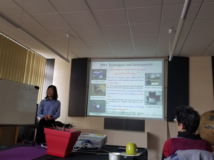 法国斯特拉斯堡大学Jean-Francious教授团队近年来在地面磁共振研究领域取得了较多显著研究成果,并成功申获2021年第八届MRS国际研讨会举办权。交流过程中,一行人密切关注了国际磁共振技术与电法勘探技术的最新研究进展,与参会的各位专家学者进行了深入的讨论。万玲副教授就我院磁共振探测技术和电磁勘探技术的最新研究进展做了学术报告,详细介绍了我院自主研发的磁共振探测仪器、电磁勘探仪器等情况。一些创新性的研究成果解决了高噪声野外探测和地下工程探测实际应用问题,引起了国际同行的极大兴趣。