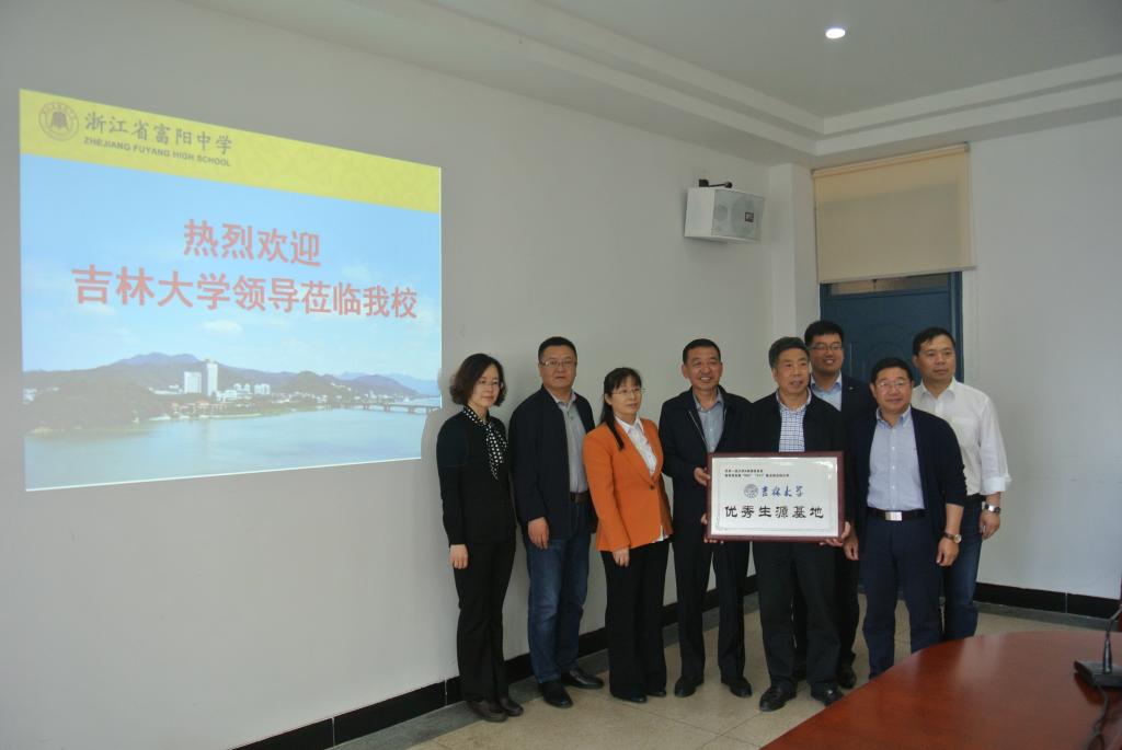 在富阳中学,校长丁明中,副校长赵承军,党委副书记周朝勇,副校长季丰与吉林大学招生宣传组的老师进行了座谈,丁明中校长介绍了富阳中学的情况和浙江省高考改革的模式,并对吉林大学招生宣传提出了建议;嵇艳鞠院长通过PPT介绍了吉林大学的情况,重点介绍了学校大类培养与交流、校内转专业、人才成长等工作,并播放了吉林大学2019年招生宣传片,并表示将根据丁明中校长的建议做好今后吉林大学的招生宣传工作,最后嵇艳鞠院长向丁明中校长授予了“吉林大学优秀生源基地”牌匾。