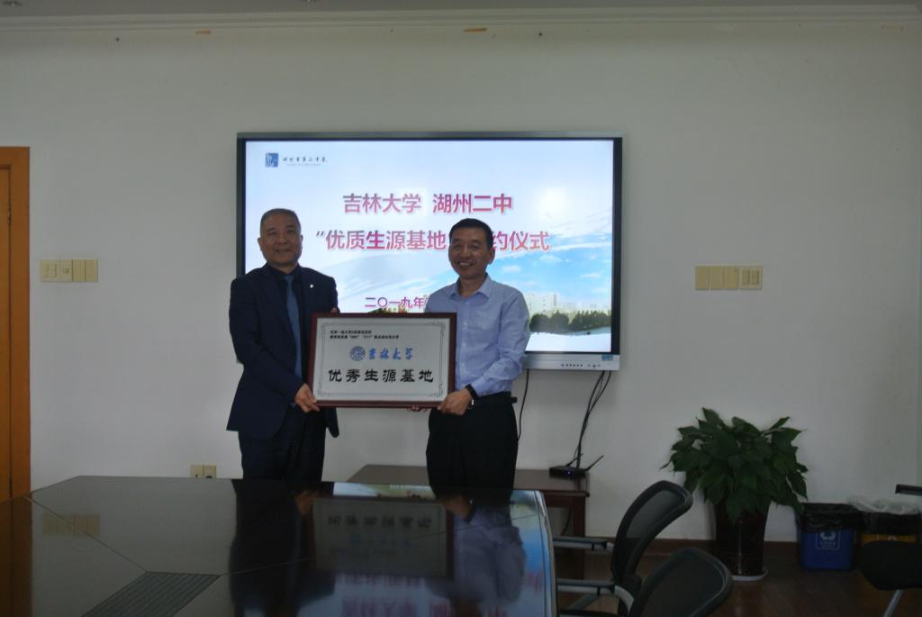 在浙江省湖州中学,副校长周凌、教导主任蒋际明、政教副主任郝加根热情接待了吉林大学招生宣传组一行。在座谈会上,副校长周凌介绍了湖州中学的情况,嵇艳鞠院长简要介绍了我校的基本情况,重点介绍了学校大类培养与交流、校内转专业政策情况,王爱民书记介绍了人才成长等情况,随后,双方就招生宣传的节点、招生宣讲会、专家到中学做专题报告进行了交流。最后嵇艳鞠院长和王爱民书记向周凌副校长授予了“吉林大学优秀生源基地”牌匾。