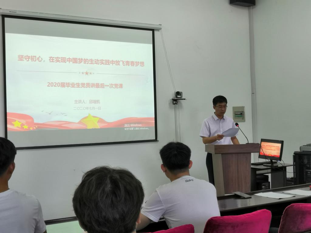 首先,党委副书记邱增凯以“坚守初心,在实现中国梦的生动实践中放飞青春梦想”为题给毕业生党员带来了一堂生动的党课。邱增凯书记从“初心是什么”出发,用一个个鲜明的事例阐释共产党人的初心,从战争年代到和平建设时期再到新时代,我党能够保持兴而不亡、盛而不衰、治而不乱,是因为共产党人始终坚守“不能忘记为谁而出发”的思想警醒、“一心一意跟党走”的坚定信仰、“坚持以人民为中心”的责任担当、“坚持把纪律和规矩挺在前面”的自我约束。邱增凯书记指出为打赢疫情防控阻击战,党中央统一领导统一指挥,广大党员牢记初心使命,充分展示了共产党员的责任与担当,在讲到学院身边党员的感人故事时,邱增凯书记一度哽咽,毕业生党员也纷纷动容,响起热烈而持久的掌声。邱增凯书记对即将走入社会岗位的毕业生党员提出殷切希望,要进一步坚定理想信念,进一步提高能力素质,进一步弘扬求真务实的精神,进一步提振精神状态,进一步增强责任担当。最后,邱增凯书记、周伟书记同全体毕业生党员一起面向党旗庄严宣誓,入党誓词字字铿锵有力,句句激昂慷慨,表达着全体毕业生党员为共产主义事业奋斗终身的决心。