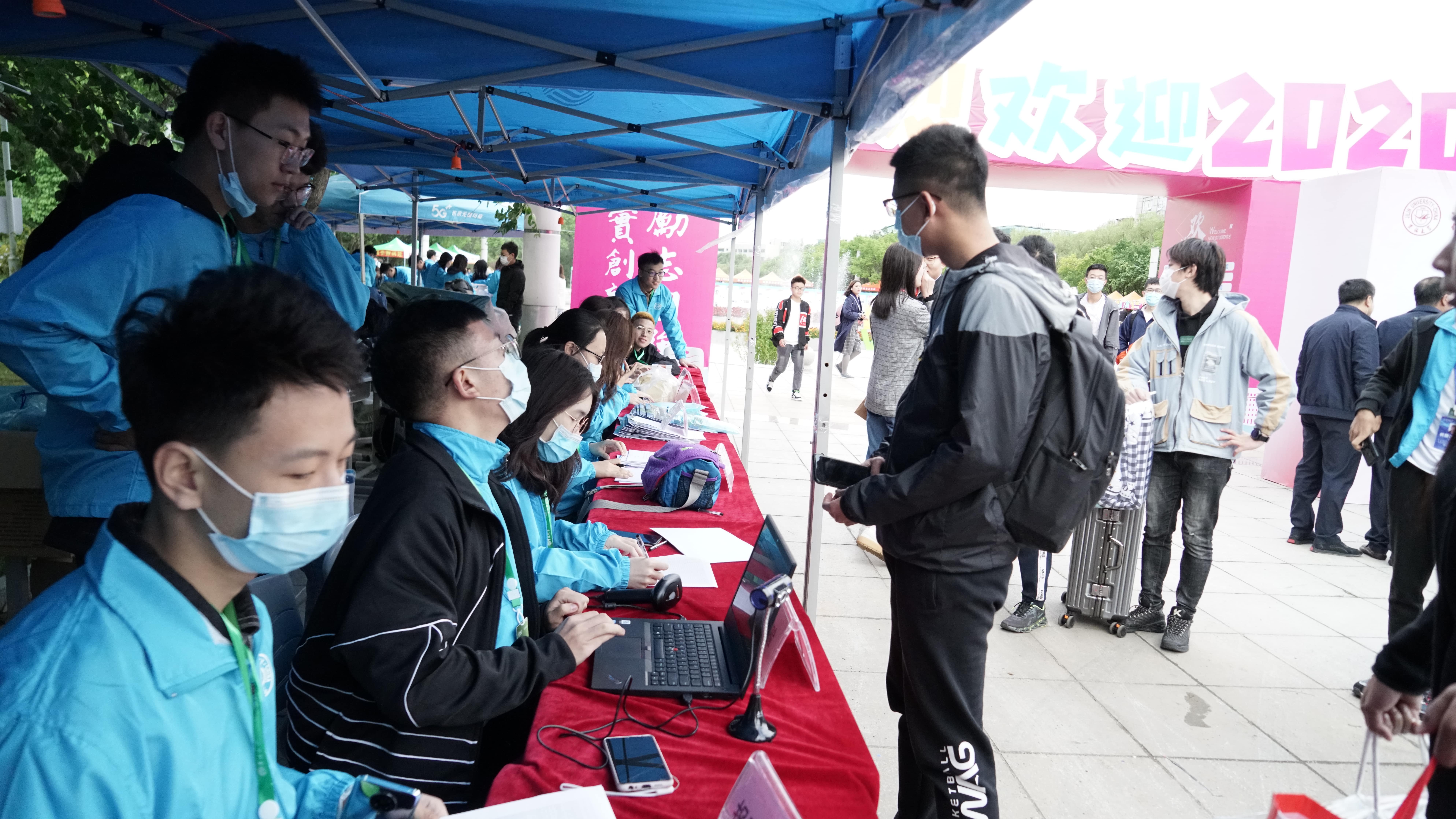 ,其余海报内容为新生名单。接待新生的前台设有以人脸识别设备为基础的身份确认岗位、一卡通及寝室钥匙发放岗位、银行卡激活办理岗位、生源地贷款岗位。我院迎新志愿者统一佩戴志愿者工作证,穿志愿者制服。另外,为配合学校防疫要求,在场所有人员全部要求佩戴口罩,新生排队报到时队伍需间隔一米以上。