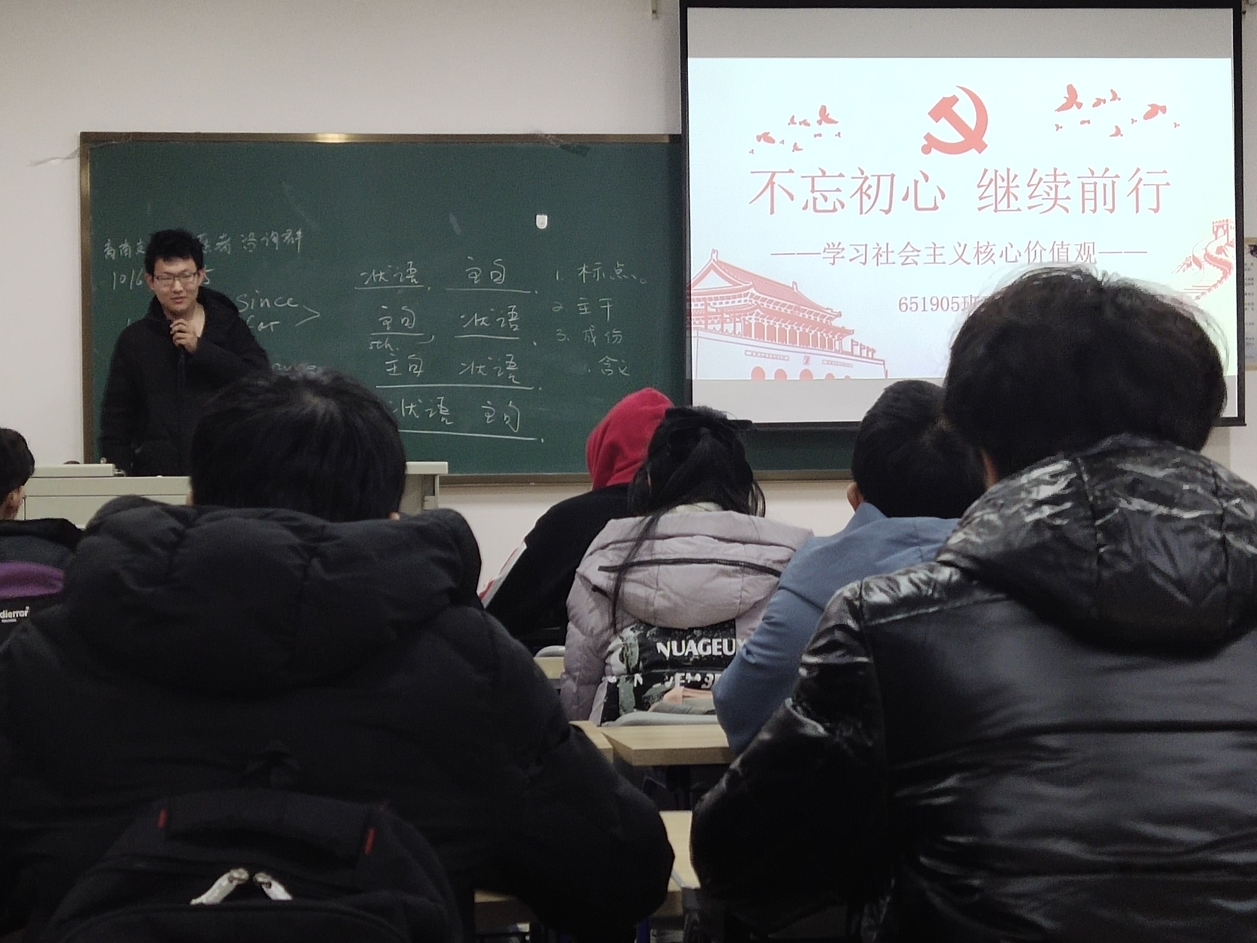 活动伊始,宋喆同学为我们讲述了社会主义核心价值观的提出历程:在新中国建立后,五项指导方针的提出,最终形成了社会主义核心价值观。随后,同学们一起观看了社会主义核心价值观的宣传视频,同学们观看认真,反响热烈,在视频幽默轻松的氛围下加深了对社会主义核心价值观的理解。视频结束后,同学们讲述了社会主义核心价值观在生活中的具体表现,并分享了观看视频的收获。活动最后,宋喆同学总结了社会主义核心价值观的意义,并呼吁同学们认真学习,认真传播,认真践行社会主义核心价值体系。至此,本次团日活动圆满结束。