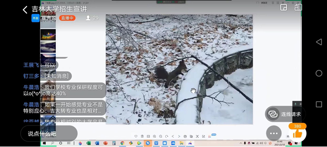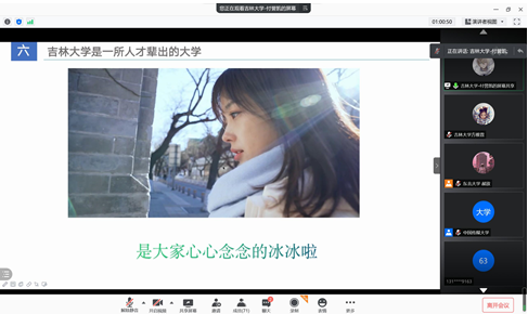 由于国内疫情形势突然紧张的原因,宣讲活动从线下更改为线上,但这丝毫没有打消宣讲同学的积极性和高中学子们的热情。首先,宣讲同学在线上为同学们播放了吉林大学的宣传影片,同学们为吉大悠久的建校历史、深厚的红色文化、浓郁的学术氛围等所深深触动,组织同学们观看的现场不断爆发出掌声。