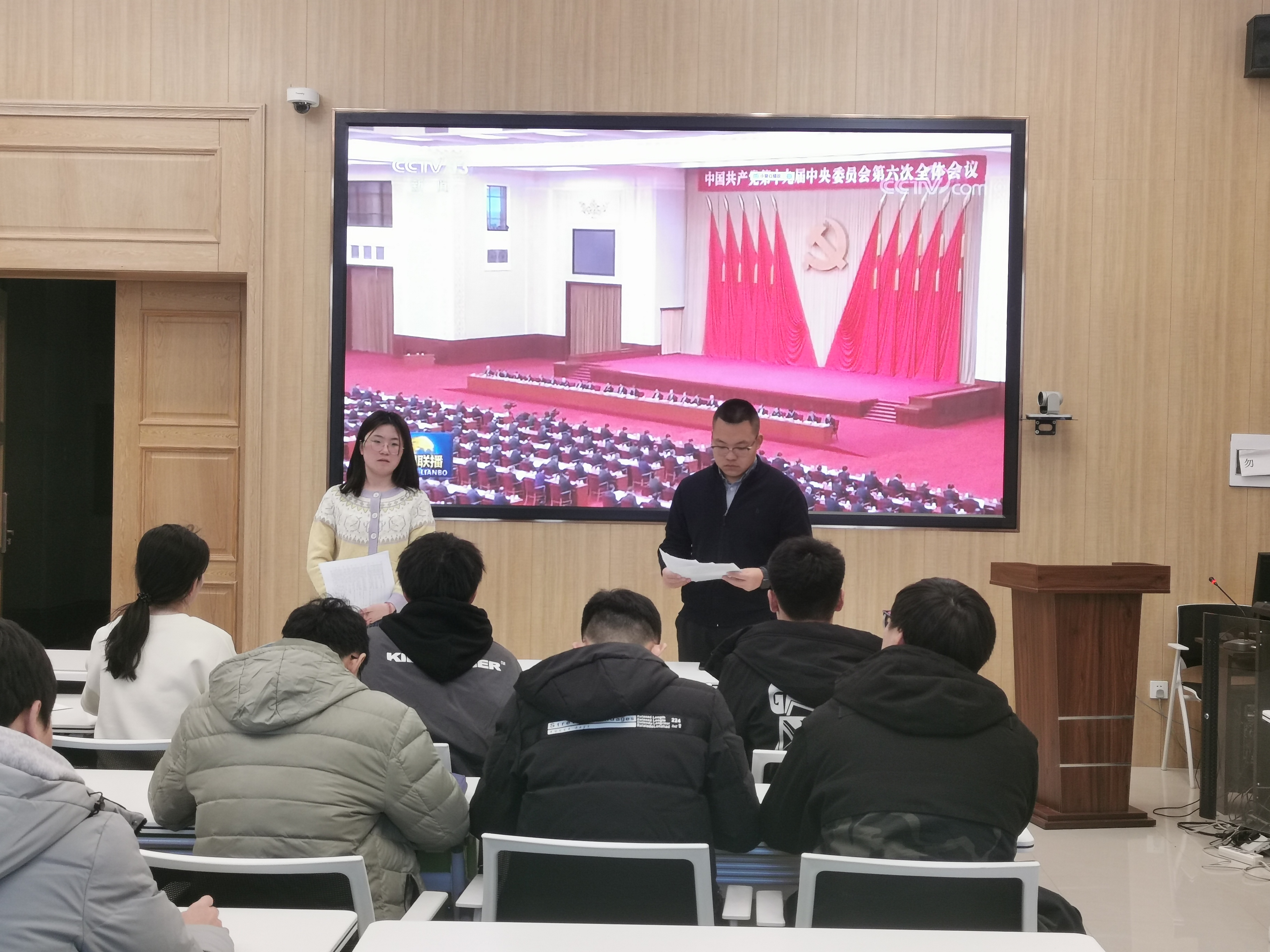 仪式结束后,团校学员参加第一期培训—十九届六中全会精神专题学习。孙鹏博老师向参会学生分发学习材料,组织学生观看中国共产党第十九届中央委员会第六次全体会议公报。观看视频后,马姗姗老师领学了党的十九届六中全会重要精神,从“三个需要”、“四个伟大成就”、“五大历史意义”、“两个确立”、“十个坚持”、“一个号召”等方面深刻领会会议内涵。在深入学习《中共中央关于党的百年奋斗重大成就和历史经验的决议》后,与会学员展开了热烈讨论。学生会执行主席王鑫宇同学表示“要秉持赶考之心,勤勉向前,既多读有字之书,亦多读无字之书”。经过交流探讨,同学们对十九届六中全会的重要意义有了更深刻的认识。