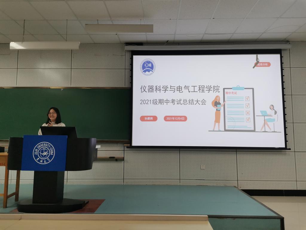在李四光楼104教室组织开展2021级学生期中考试总结大会,辅导员孙鹏博老师对本次期中考试进行了总结。