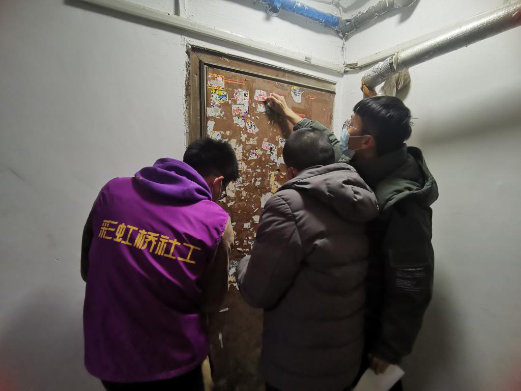 社区门口,学生志愿者身着统一服装,齐声唱起“学习雷锋好榜样,忠于革命忠于党”,一句句口号铿锵,一阵阵歌声嘹亮,带着满腔热情,同学们带好工具分头行动开展志愿服务,他们对社区监控盲区、户外墙体和楼道墙壁的非法张贴物进行了彻底清除,为美化社区公共环境献出一份力量。为了配合社区疫情防控工作,志愿者们细心地在每个单元门上张贴疫情防控排查通知,帮助社区宣传最新的防疫政策。了解到社区内有一个特殊的孤残家庭,学生们结伴走进家中看望,在亲切交谈中,社区工作人员和志愿者们详细询问着日常生活与实际需求,用行动送上一份关心和温暖。