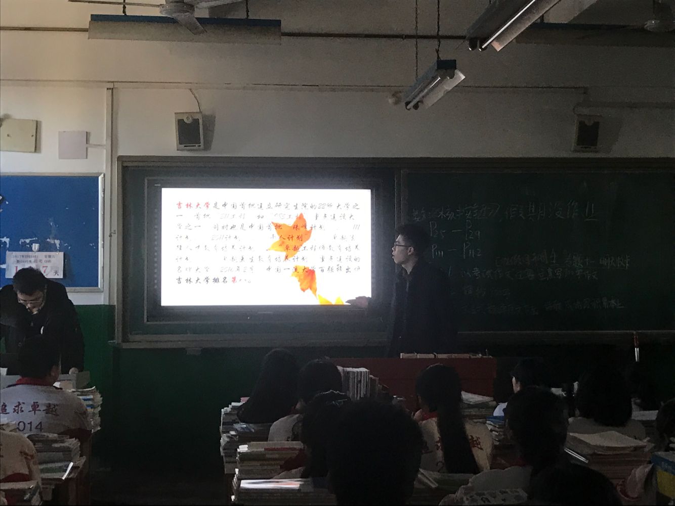 此次活动主要目的为发扬吉林大学“求实创新,励志图强”的传统,让更多学子了解吉林大学的风采,为吉林大学引入更多新鲜血液。宣讲团队在正式宣讲前十天返回母校与学校领导进行协商安排,最终确定日期与地点,同时进行工作安排,包括活动宣传PPT的制作、宣传视频的准备以及摄影记录人员安排。活动定于下午2点进行,相关人员提前布置好现场,准备资料,开始时组织学生有序进场,并发放宣传手册。宣讲正式开始,队员们首先播放了吉林大学的宣传视频,并在视频的最后播放了吉林大学校歌,台下学生热情洋溢,十分向往。随后队员们结合PPT进行了更加全面细致的介绍,主要介绍了吉林大学的各专业概况、自然环境、人文环境等方面。最后队员们与高三学生进行互动,学生们踊跃地举手提出了自己的各种疑问,各队员都一一进行了细致的解答。活动共持续两个小时,最后圆满结束。