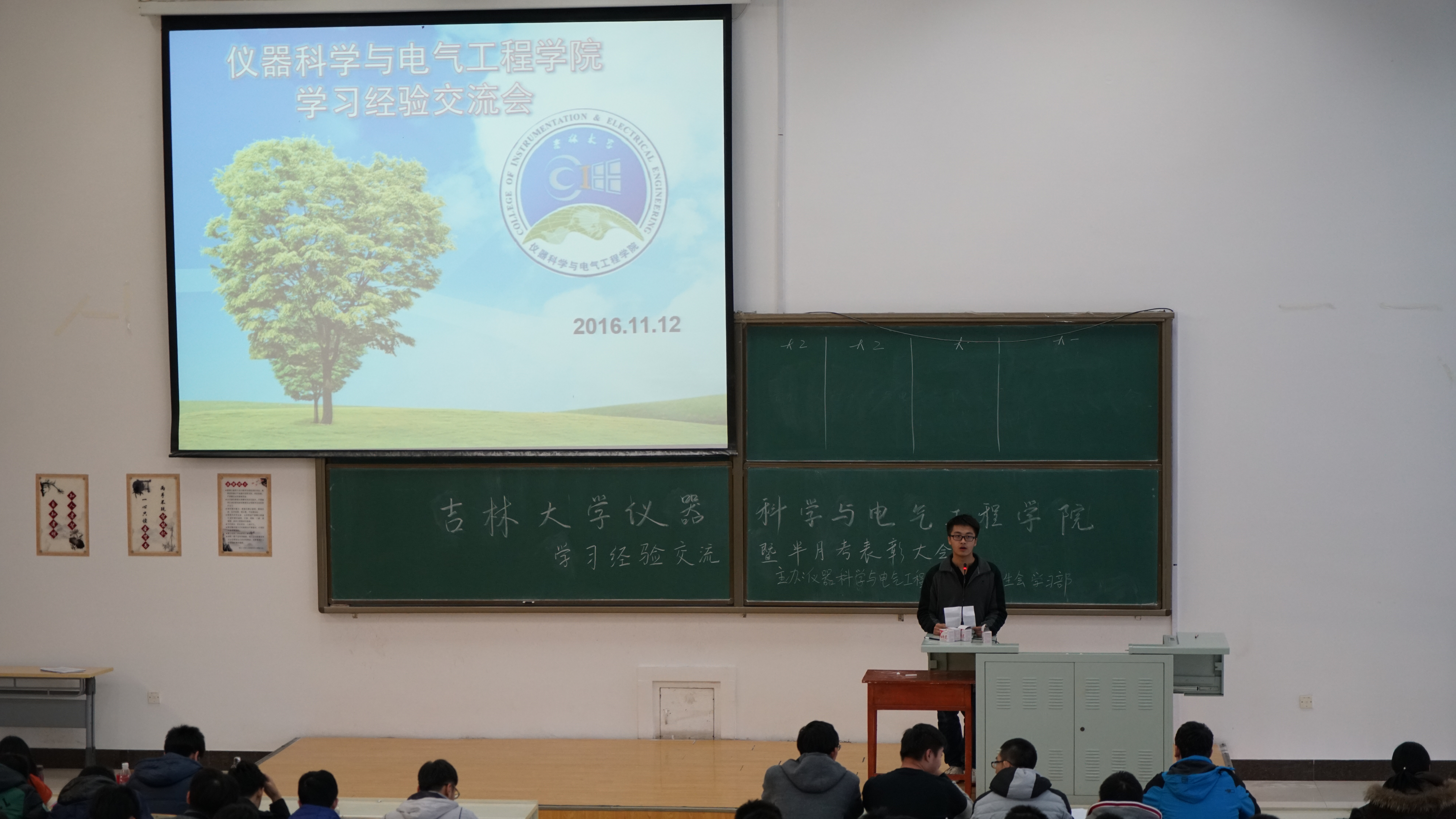 本着促进同学们之间学习经验交流、激励同学们努力学习、督促同学们树立正确目标并合理规划自己的大学生活的理念,仪电学院学习部于2016年11月12日下午1:30在李四光二阶教室举办了学习经验交流暨半月考表彰大会。第十一届团委副书记于一兵、第十二届团委副书记李芮林、新闻媒体中心主任马天录、学习部部长王灿以及仪电学院全体大一、大二学生参加了此次大会。