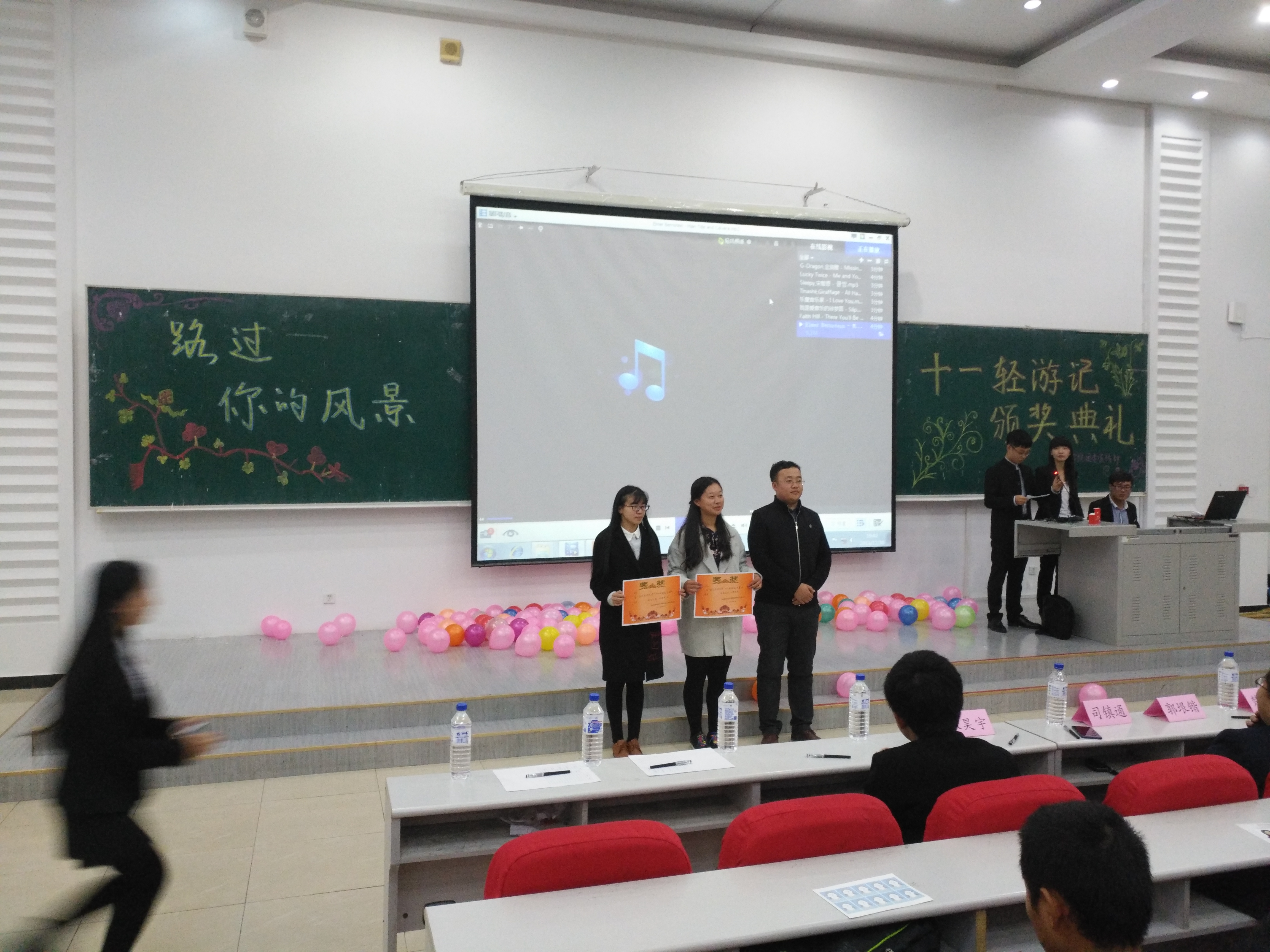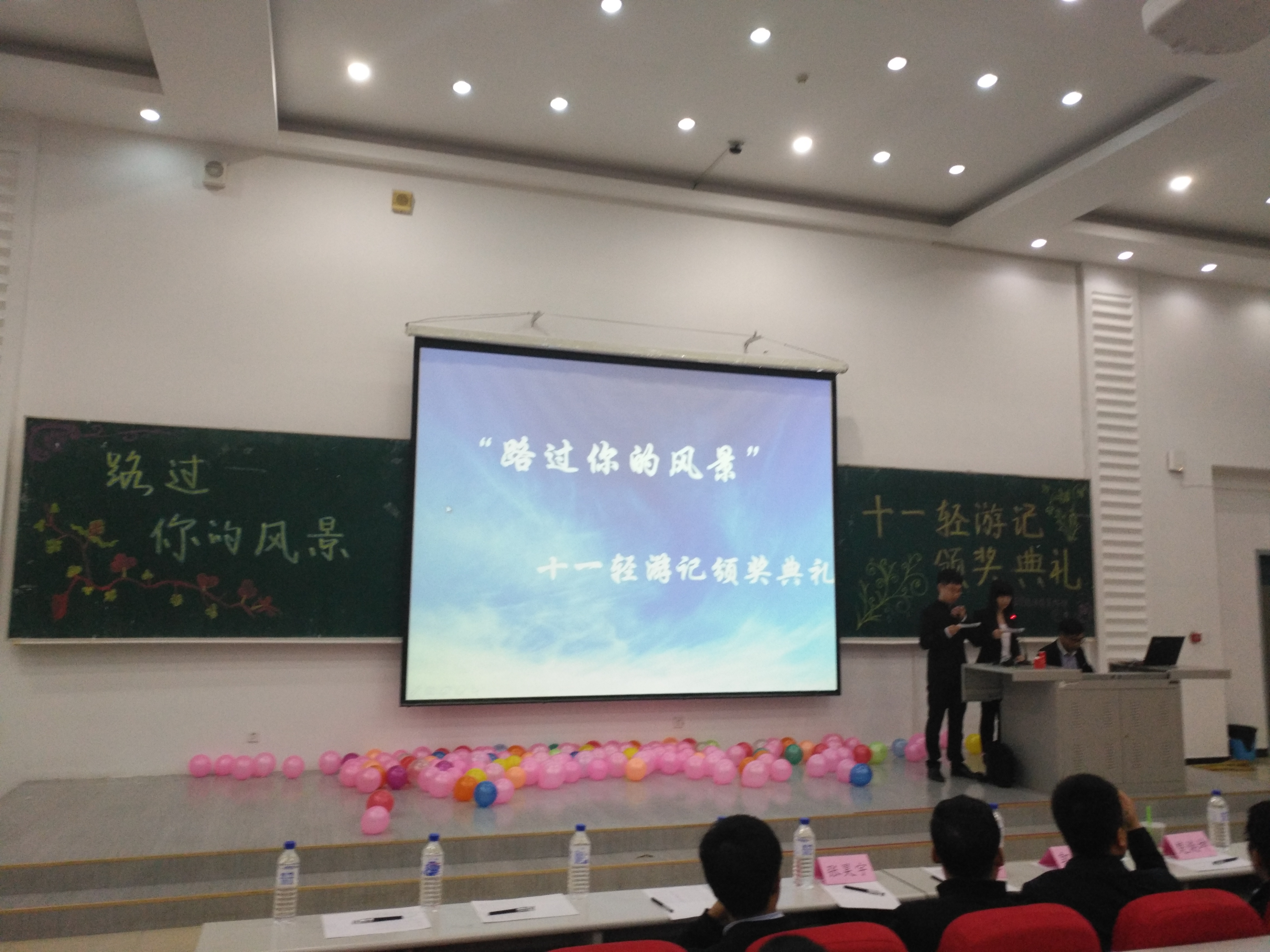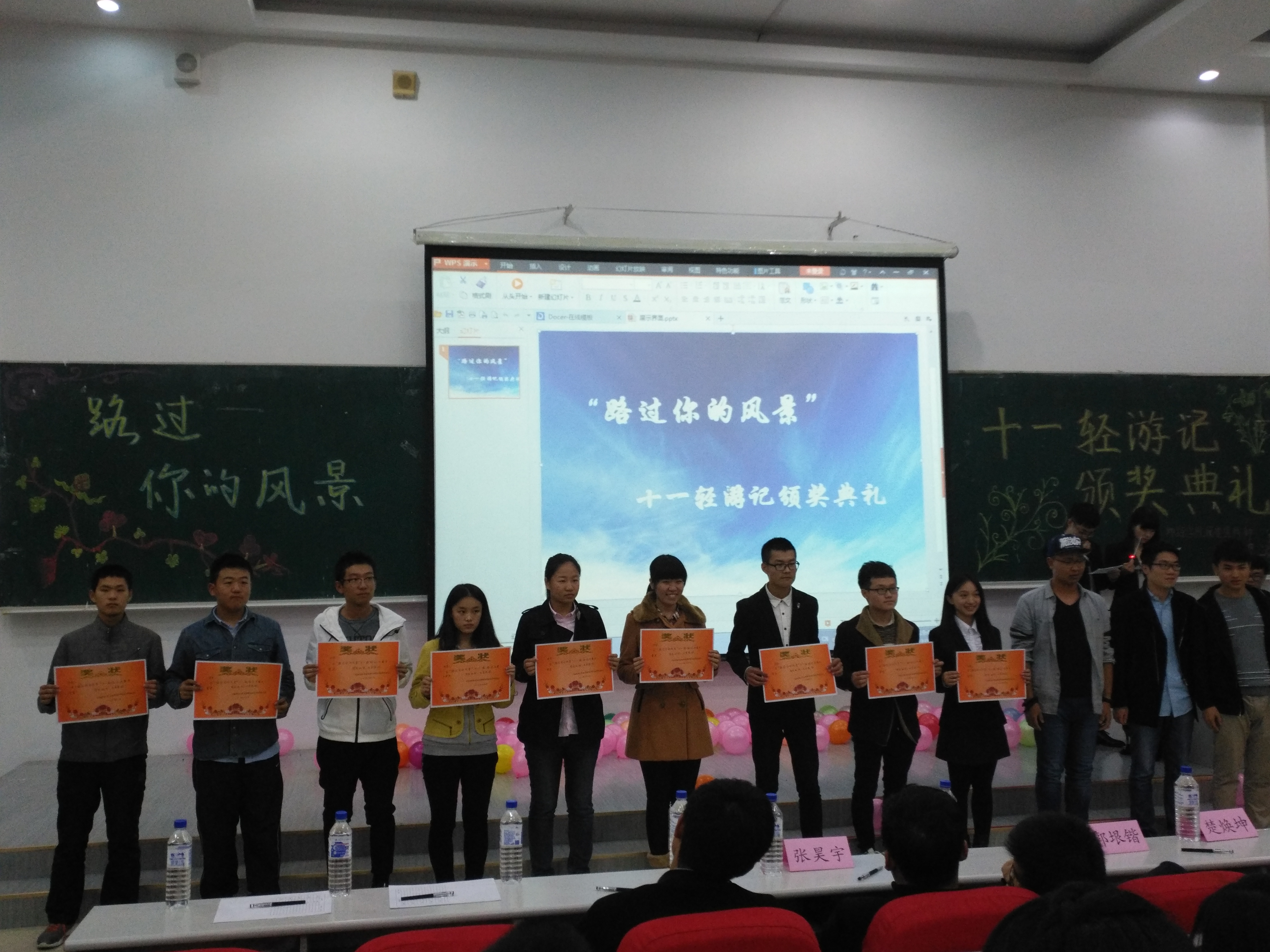 2016年10月16日晚六点三十分,由地探学院、仪电学院、地科学院、环资学院、建工学院、商学院、经济学院多个学院主办的“路过你的风景”十一轻游记最终评审以及颁奖典礼在布置会场、彩排等多项安排后顺利在经信F5举行。我院郝雨竹、单婉盈、陈亦楠三位同学作为参赛选手参加了此项活动,另外,15级辅导员张昊宇老师以及多位其他学院老师到达现场参与评选。活动期间,十五位参赛选手对各自的作品进行了生动形象的描述,描绘了各式各样的或优美或壮丽的富有特色的风景,讲述了拍摄的时间、情景以及自己在十一旅游期间的感受,让在场听众仿佛身临其境,沉浸在照片中风景的世界里。随后,主持人对活动的赞助方日新楼美奈映像证件照专门店进行了简单的介绍。