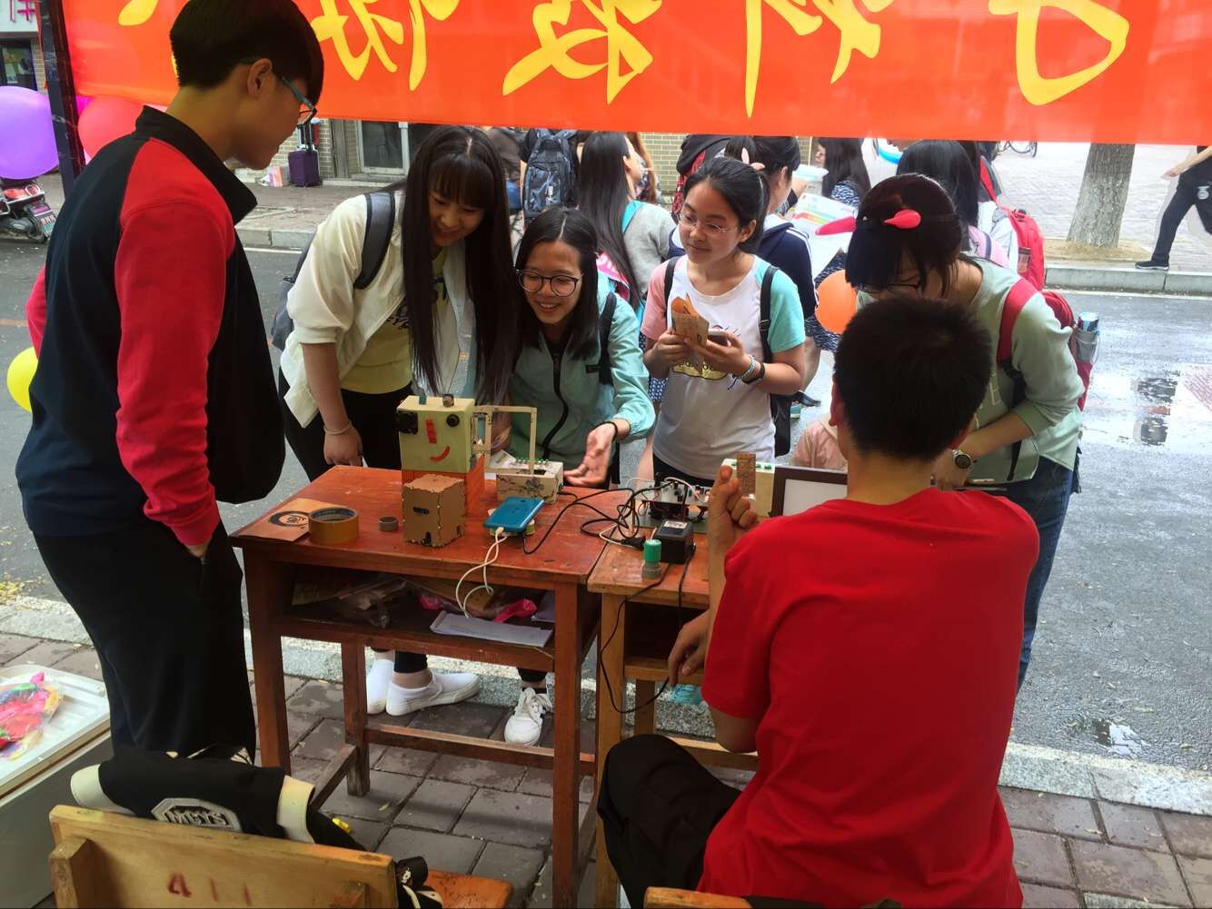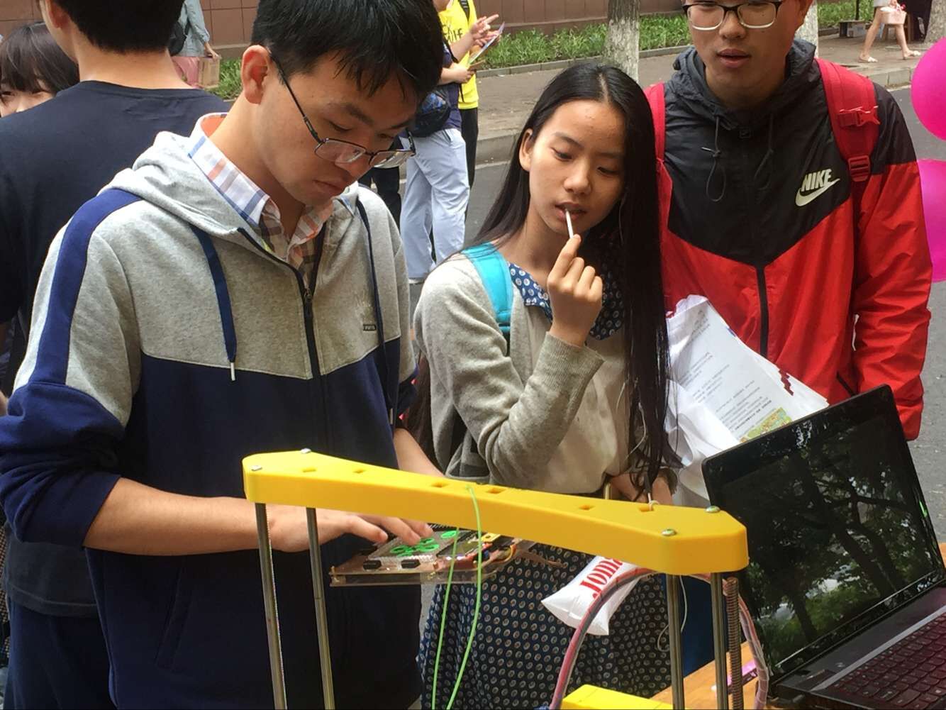 早些时分,尽管嘉年华活动还未开始,可是我院科协的帐篷前就已经有不少的同学被正准备展览的我院同学在电子设计大赛中的优秀科技作品吸引了过来。看着正在调试中的3D打印机、光控时控调光玻璃、等离子音响、自平衡小车等出色的作品,大家十分好奇,更多的还是惊叹。这些制作精美、创意十足的电子设计作品,让同学们和市民朋友感受着世界的新奇和科技的魅力。上午11点,嘉年华活动正式开始。电子科技协会的帐篷前马上便围满了慕名前来的吉大师生和市民朋友,大家都好奇地向科协的同学们提出自己的问题。科协成员一一为大家展示每个作品的功能,耐心地回答大家提出的问题。本次活动还准备了互动环节,各位游客既可以选择列举自己所了解的电子设计领域中常见的10种基本元器件名称,也可以来用DIY电子琴演奏一首自己熟悉的曲目等等。在科协的同学们的提示和帮助下,同学们都在收获新知识的快乐中完成了任务,并都满意地给电子科技协会点了大大的赞。