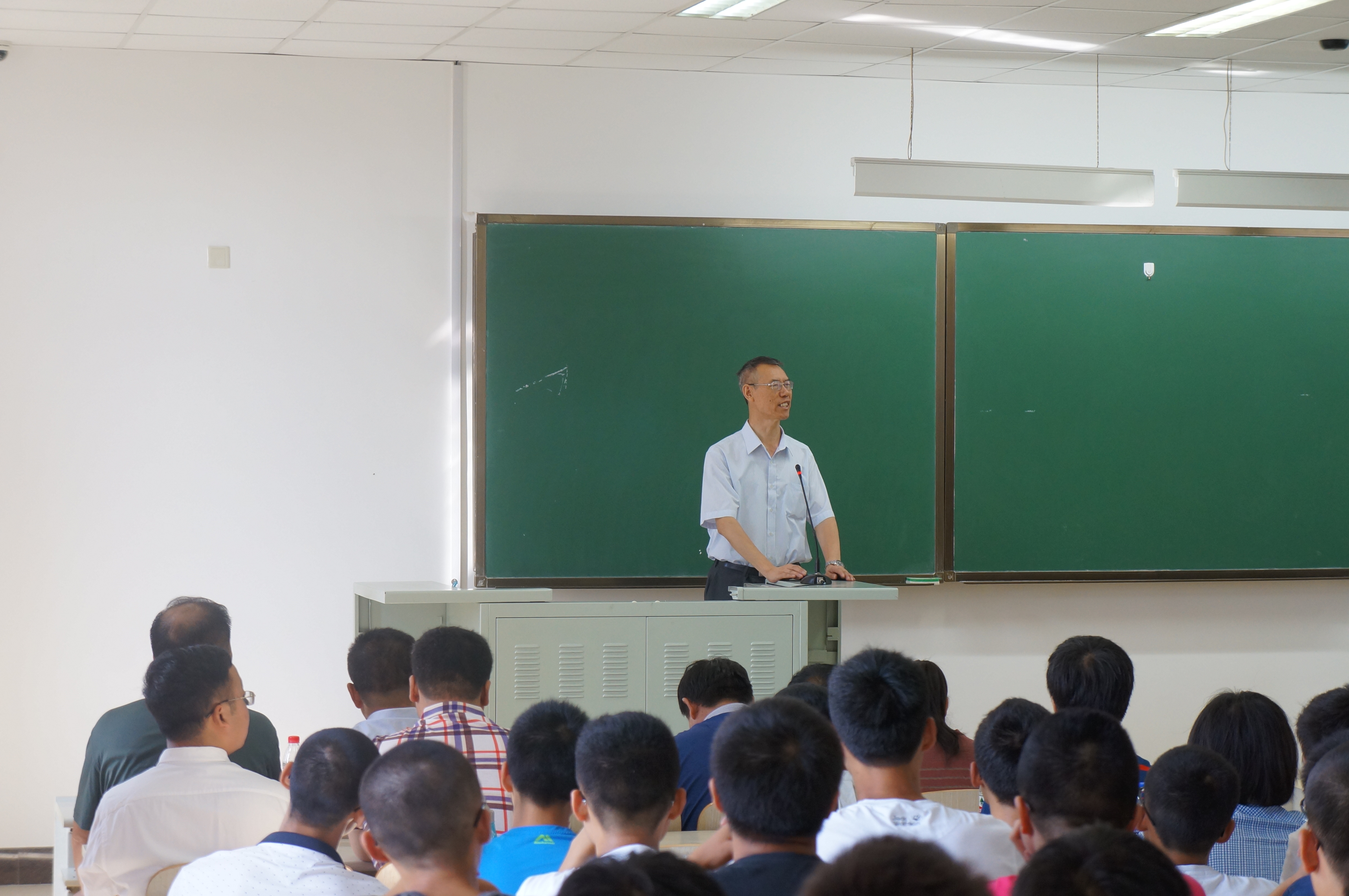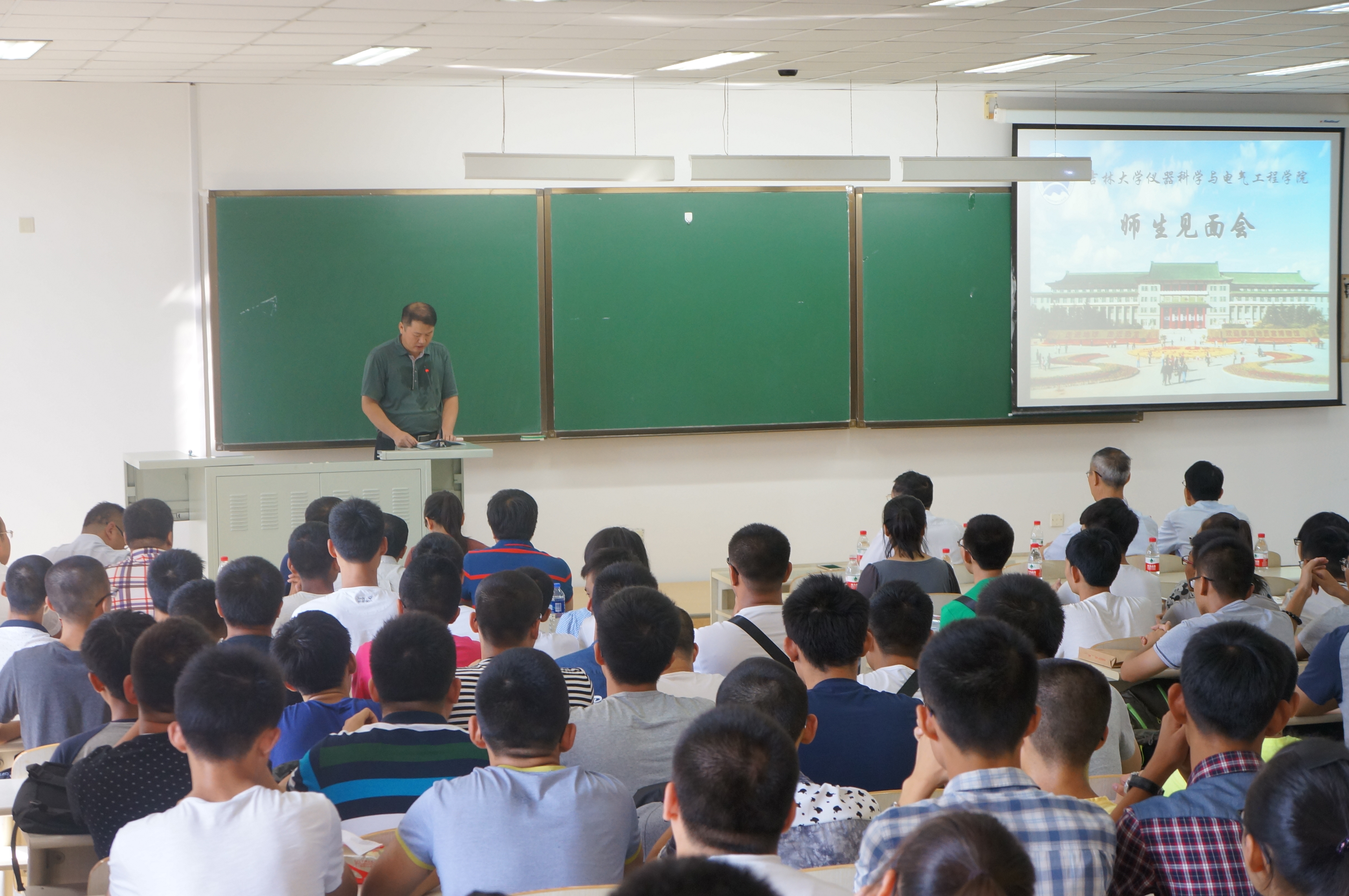 邱增凯老师首先向2016级的新同学介绍了参会的学院领导老师。然后由林君院长发言,院长向全体新生讲解了学院的总体情况,根据学院的历史发展、学科建设、师资力量、科研成果、人才培养,优秀校友,发展方向等几个方面向新生们进行了简要的介绍,同时,他还借助哈佛大学研究的结果鼓励新生要有明确的目标,他还鼓励培养新生们海纳百川,胸怀天下的激情,希望16级新生可以在未来的发展中为祖国献上自己的力量。在新生对自己的学院和所学专业有了初步了解之后,副院长陈祖斌教授为新生讲解学院的教学工作。他根据学校的规章制度,在学分制度、学籍变动、校际国际交流、保研直博政策,学业预警工作等方面向新生们做了详细的介绍,让全体新生感受到吉林大学浓郁的学习氛围,他同时还鼓励培养学生的自我动手、创新实践能力,对新生们在未来四年的发展提出了美好的期许。 教师们平易近人的笑容,以及对新同学亲切的问候,让2016级新生感受到了大学的温暖与真情。全体师生在一种温馨、和谐的环境下结束了本次的师生见面会。