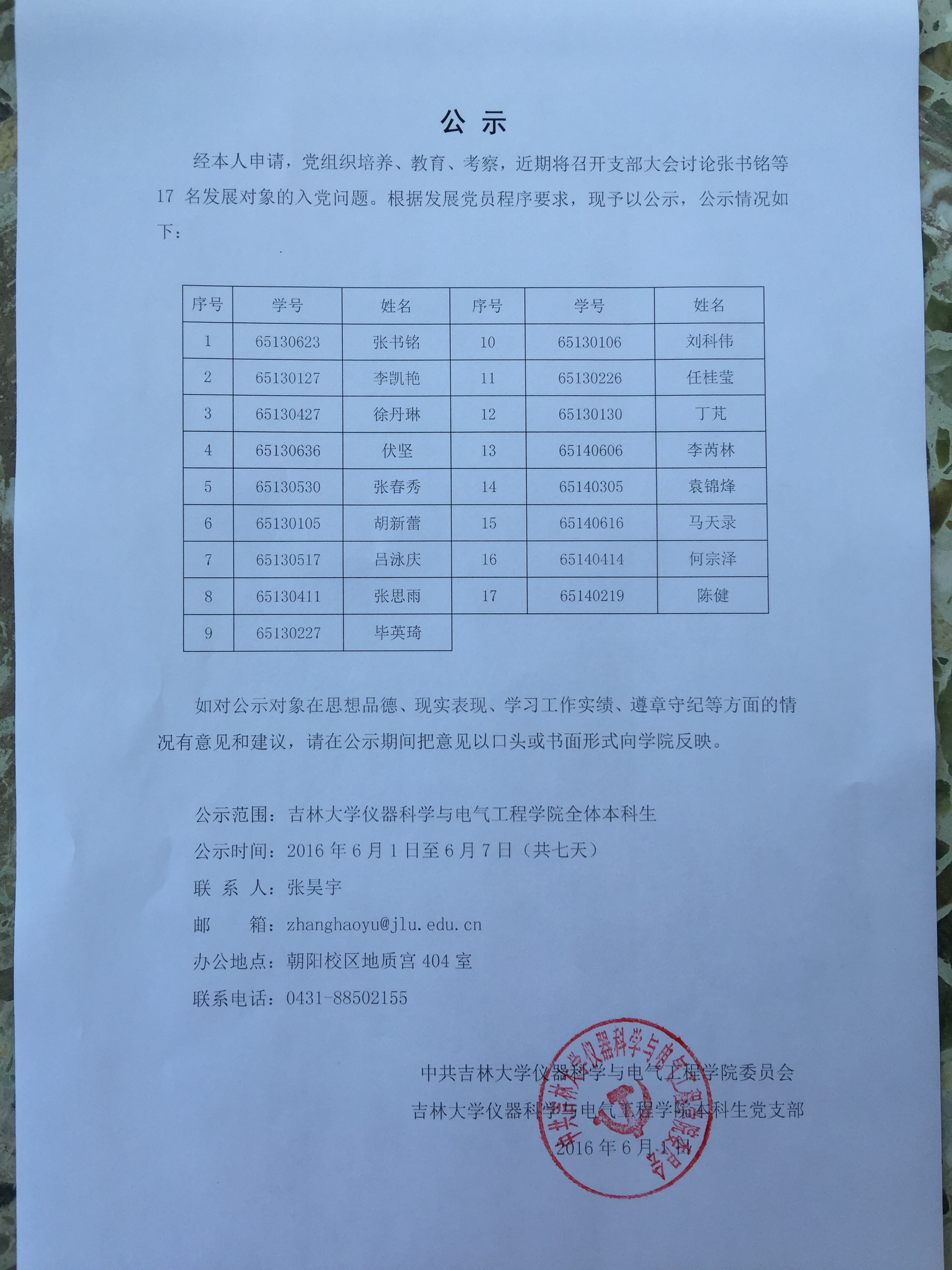 经本人申请,党组织培养、教育、考察,近期将召开支部大会讨论张书铭等17名发展对象的入党问题。根据发展党员程序要求,现予以公示,公示情况如下: