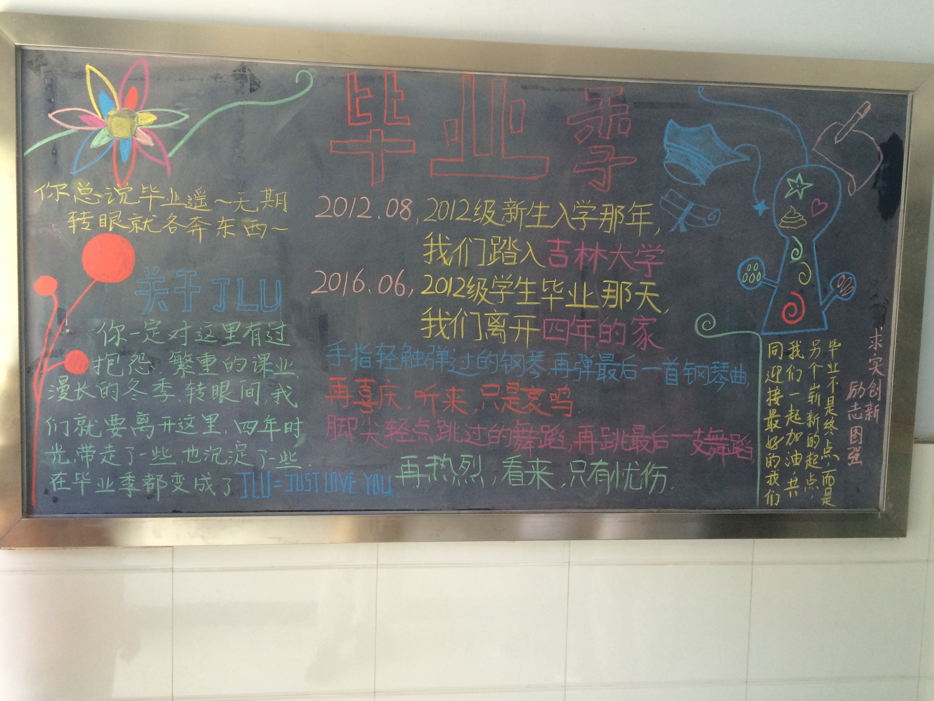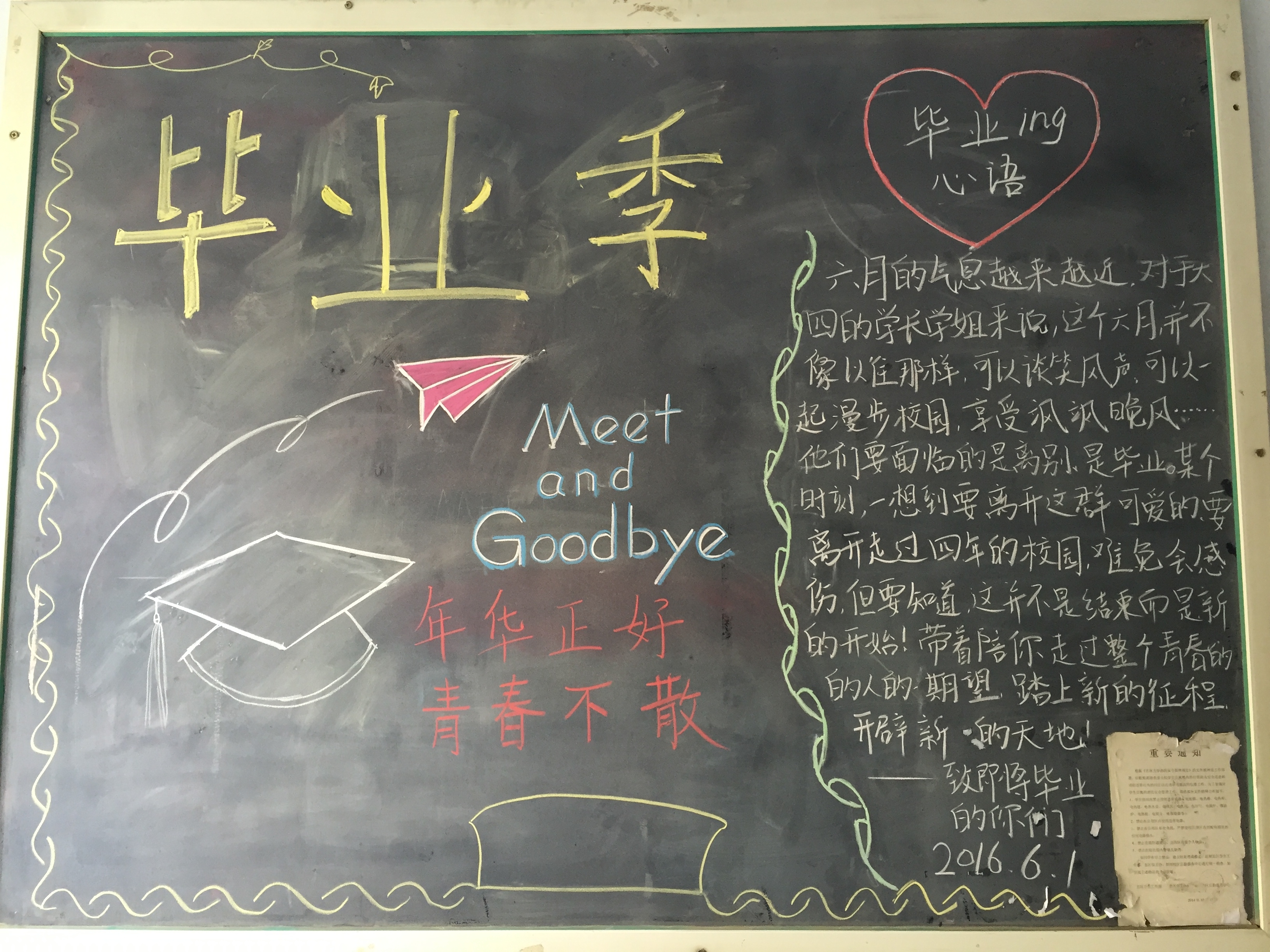 团委于2016年 6月1日15:00在朝阳校区一、二、五学生公寓开展了绘制“毕业季”主题黑板报活动,我院在校生代表参与了本次活动。