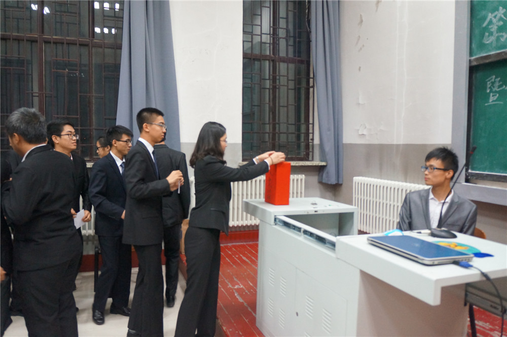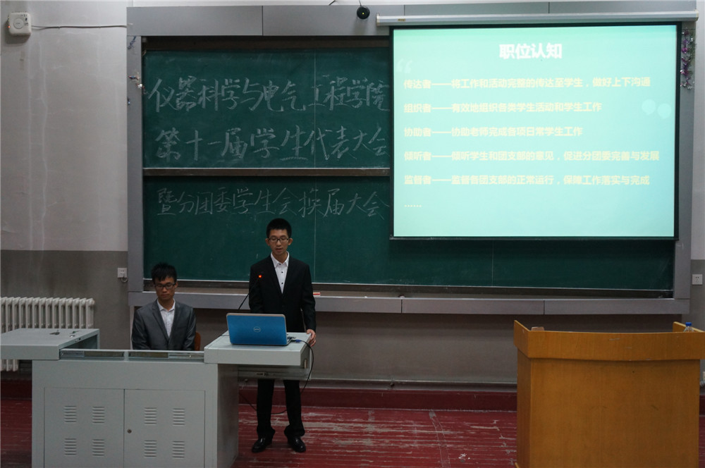 大会在轩昂壮阔的中国共产主义青年团团歌声中拉开序幕。此次大会首先审议并通过了第十届学生会主席李昊阳同学代表分团委、学生会进行的工作报告,回顾了一年来第十届分团委学生会的工作历程。对这一年来取得的成绩予以展示,同时深刻反思并陈述各方面工作的不足。随后,院团委书记兼2012级辅导员蔡印老师为第十届团学组织主要学生干部颁发了任职证书。证书颁发仪式结束后,学院第十届分团委副书记付博同学宣读了第十一届团学组织主要学生干部候选人名单,随后候选人依次上台演讲竞职。候选人们结合演示文稿陈述了自己的竞选理由和个人优势、组织和岗位认识以及任职后的工作构想,精炼而自信的演讲赢得了与会人员的阵阵掌声与赞叹。演讲完毕后各学生代表依次上台公开投票,民主选举产生新一届主要学生干部。最终,2013级于一兵同学当选第十一届分团委第一副书记,岳良广同学当选学生会主席,穆怀志、侯雪征、任晓闯当选分团委副书记,樊毅尧当选学生会副主席,大会还选举产生了分团委、学生会各部门负责人及科技协会、“牵手”青年志愿者协会、新闻通讯社等学生组织相关负责人。随后,2014级何宗泽同学宣读了倡议书,倡议团学组织的学生干部们认真工作,兢兢业业为同学们服务,为我院的发展贡献自己的一份力量。