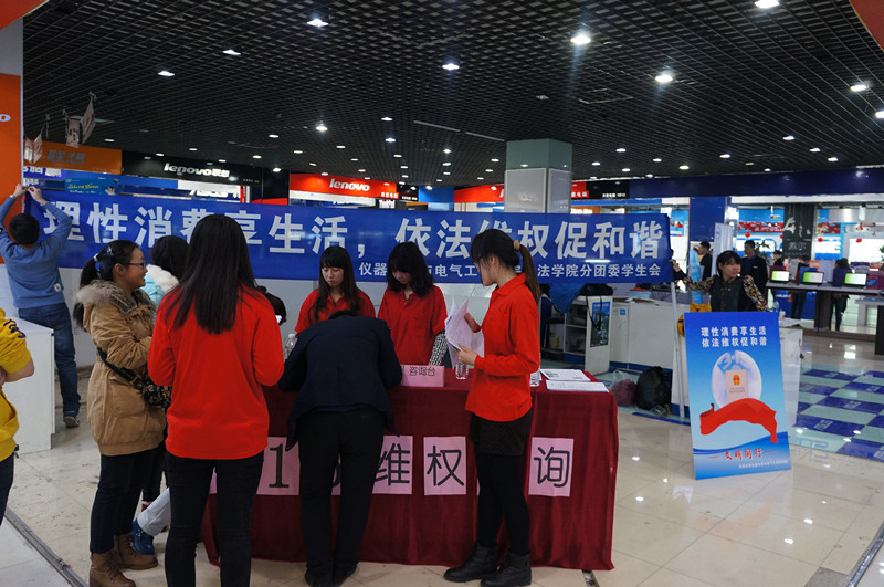 我院青年大学生连同法学院志愿者分四路分别来到长春市百脑汇科技大厦、长春市红旗街万达商场、吉林大学中心校区三食堂、吉林大学朝阳校区男女寝门口展开消费者维权活动。志愿者设立了咨询台,帮助市民进行相关申诉和举报,解答市民的维权疑问,与市民进行维权法律常识的交流。在整个交谈过程中,志愿者发现,消费者的法律维权意识需要普及深化,消费观念需要绿色环保。最后,志愿者在各个活动现场举行了签名仪式,所有志愿者邀请前来参与活动的市民在横幅上签名并写下大家在消费维权方面的美好愿望或建议,增强大家对消费现状以及消费者维权保护方面的信心。