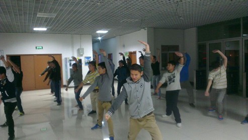 紧张有序的训练在每天19:00拉开序幕,首先,由2012级参加上届运动会三路长拳比赛的学长向队员们讲述动作要领,并通过亲身示范形象地展示细节上需要注意的方面。随后,在学长的带领下,全体三路长拳团队队员整齐划一地列好方阵,认真进行了多达十余次的整套动作的演练。在紧凑有力的伴奏声中,每一位队友都热情满满,毫不懈怠,力求把每一个动作做到精准到位,虽然训练量较大,但没有一个队员喊苦叫累,团队凝聚力得到了充分的彰显。每次训练历时一个多小时,最终在团队队友相互分享动作心得的交流沟通中落下了帷幕。