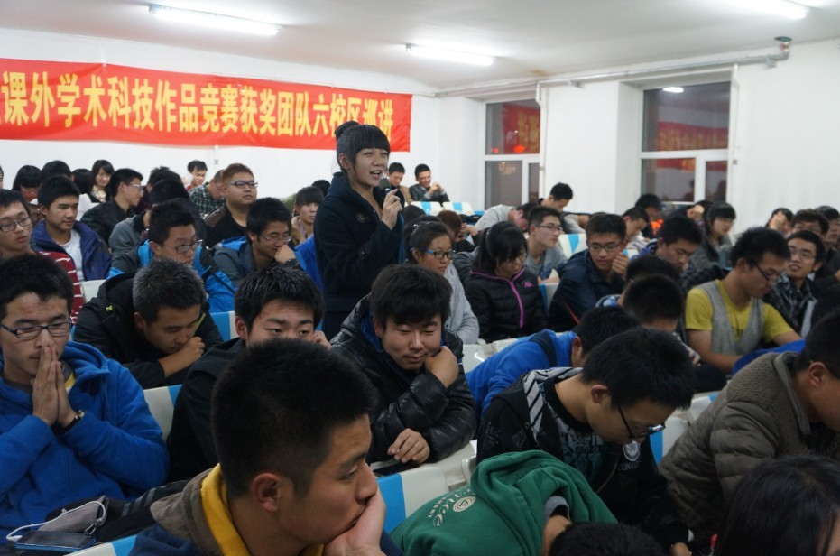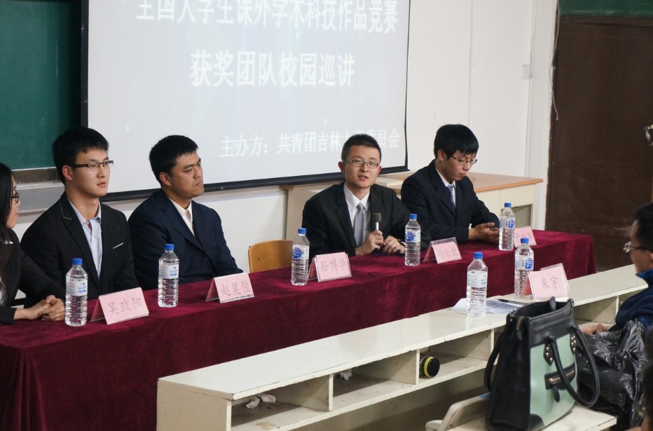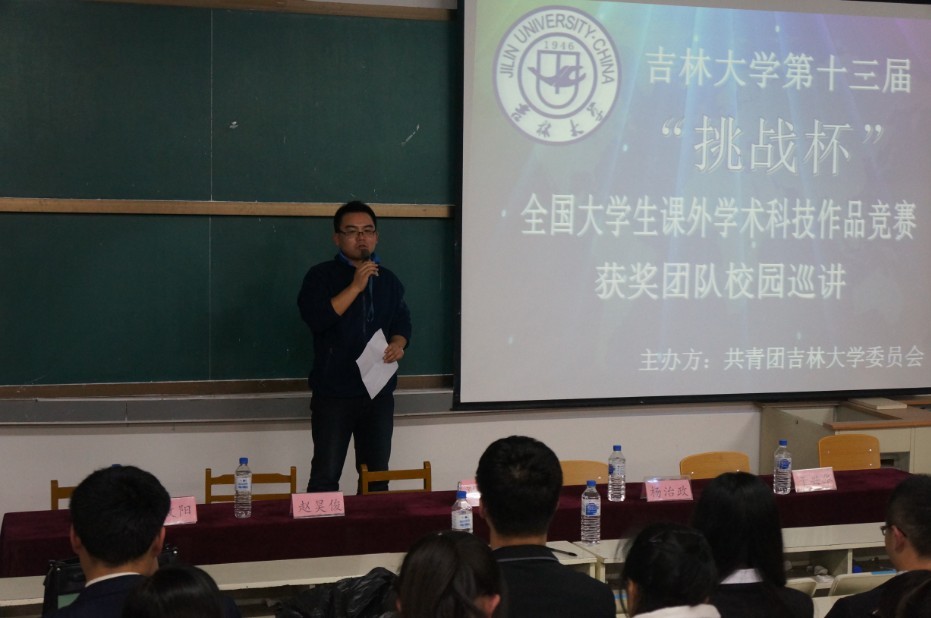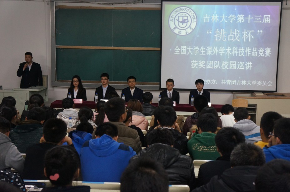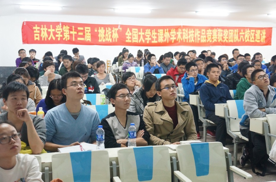 为丰富我校科技创新活动,搭建科技创新交流平台,营造浓厚的科技创新氛围,展示我校“挑战杯”的优秀成果,分享“挑战杯”的辉煌成绩,感受“挑战杯”获奖团队的独特魅力,全面激发青年学生参与科技创新活动的热情,校团委主办了吉林大学第十三届“挑战杯”全国大学生课外学术科技作品竞赛获奖团队校园巡讲活动。2013年11月8日18:00,第四场巡讲活动在朝阳校区水工楼518阶梯教室举行,本场巡讲由日本女优