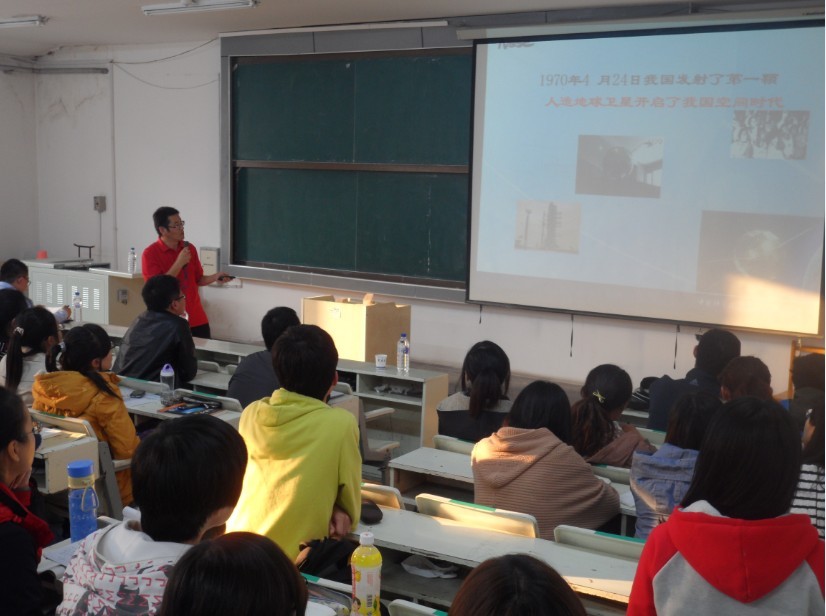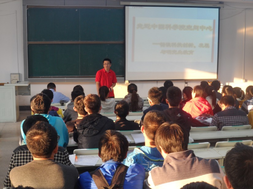 会上,朱宇隆重地为大家介绍了中国科学院的潘奎英和张作和两位老师,并对他们的到来表示热烈的欢迎。随后,中国科学院国家空间科学中心研究生部主任潘奎英老师做了专题宣讲,他首先肯定了我院本科生的教育培养水平,他表示学院严谨科学的培养体系无疑使学生在未来拥有了把握机遇的坚实基础,这一点从我院2010级同学在今年中国科学院夏令营的出色表现便可见一斑。随后,他向大家介绍了中国科学院国家空间中心的相关情况,中国科学院国家空间中心作为我国人造卫星事业的摇篮迄今已有55年的辉煌发展历史,是中国航天发展三个里程碑“东方红一号”、载人航天和探月工程的重要奠基者和贡献者,为我国的航空航天事业立下了不可磨灭的功勋。中国科学院国家空间中心更是1978年我国恢复研究生教育后首批具有博士学位授予权的单位之一。多年来中心依托强大的科研资源优势,科教结合,其研究生培养专业已经涵盖了空间中心“空间物理和空间环境”、“空间电子工程技术”和“微波遥感与信息技术”三个主要科技发展方向。最后,张作和老师进行了补充,他强调无论是空间探索还是航空航天,科学的发展都离不开仪器设备的支持,只有灵活的创新仪器才能实现科学梦想,所以他真诚热情地邀请有意愿的同学加入空间中心,共同为我国的空间事业贡献力量。
