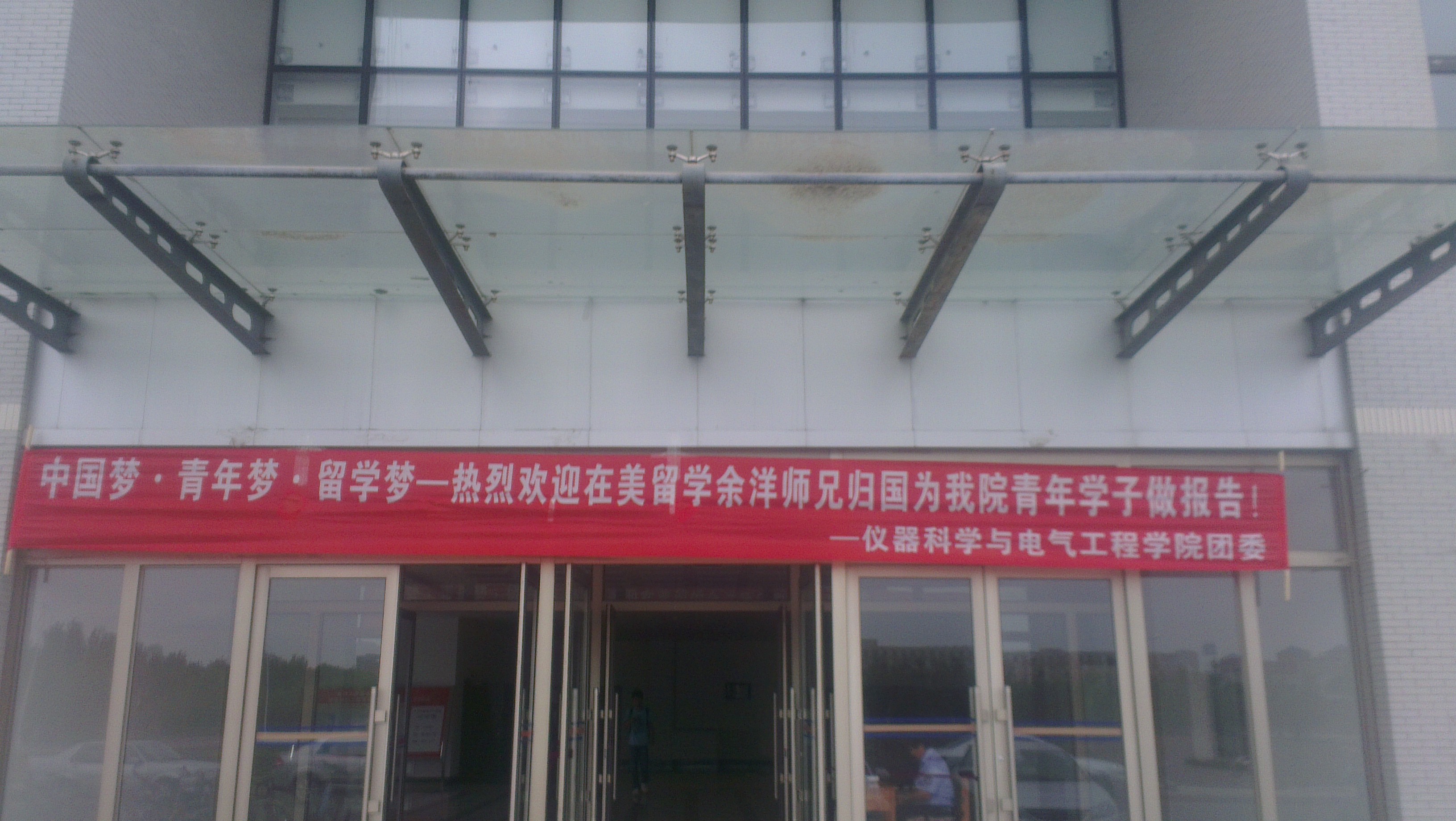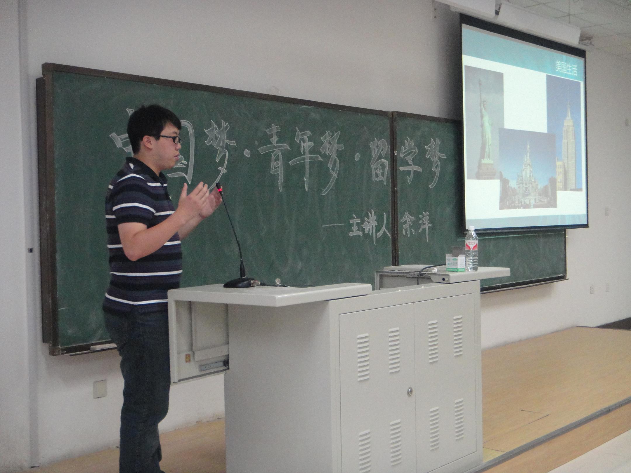 在讲座正式开始前,朱宇向同学们详细介绍了本次专题讲座主讲人余洋同学的相关情况。余洋同学是我院2008级本科毕业生的优秀代表,现于美国纽约大学攻读硕士学位;其在校期间刻苦钻研,成绩优异,2012年本科毕业后成功申请了世界知名大学——纽约大学攻读硕士学位;他所就读的美国纽约大学是全美最大的私立大学之一,该校因有31名诺贝尔奖得主和许多知名校友而享誉世界。朱宇希望广大同学能借此机会认真学习余洋同学刻苦钻研、积极拼搏的宝贵精神,进一步了解美国文化,认识中美文化差异,同时希望大家深入思考“美国梦”与“中国梦”的异同,深刻领会“中国梦”的重要内涵。