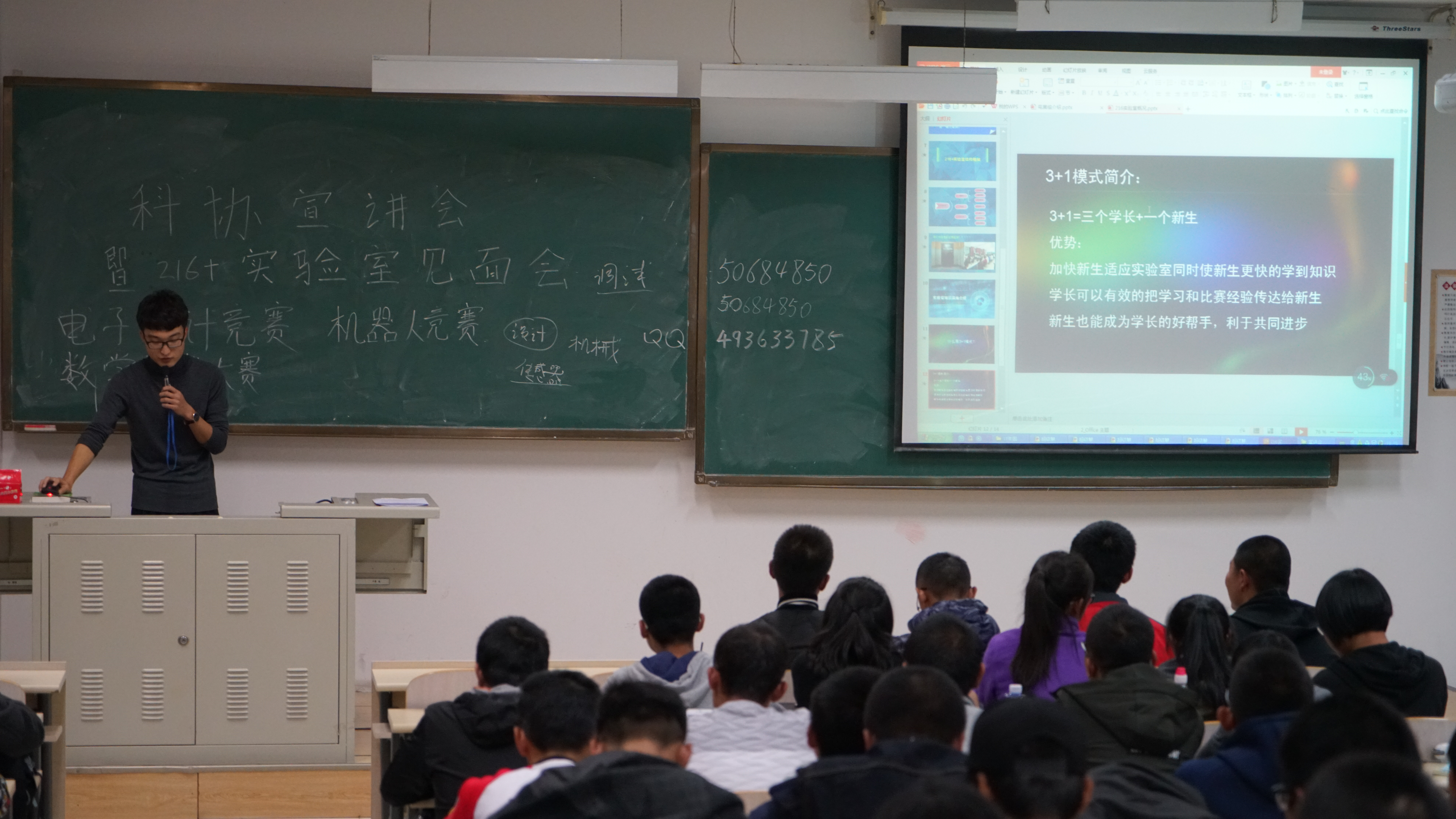 首先,科协负责人刘赫对我院大学生科技创新协会进行了简介,呼吁大家在搞好学业的同时积极参加科协的培训,从培训中提高自己的动手能力,提高自己的科技创新能力,争取在各类竞赛以及科技创新中取得更大的成果。随后实验室负责人陈浩介绍了216+实验室概况并现场讲解了“3+1”模式,实验室各项目负责人也对各自负责的项目进行了简要介绍。最后216+实验室的每个小组通过精美的PPT介绍自己的小组概况以及个人心得,同时分享了他们获得的成就以及成就背后的辛酸与快乐。活动期间,现场掌声激烈,求知氛围浓厚。此次活动不仅解答了2017级新生对科协及216+实验室的困惑,使他们学习了我院代代传承下来的宝贵经验,而且提高了2017级新生对参加我院科技协会及216+实验室的积极性,极大地激发了同学们对科技创新知识的向往。