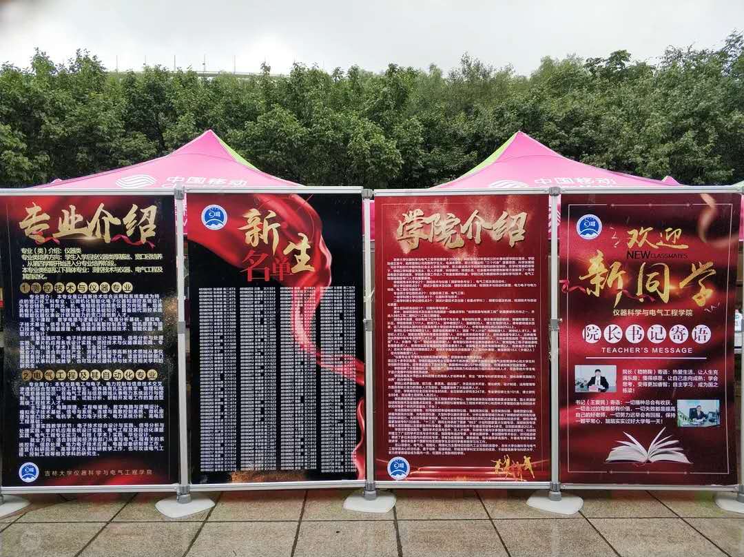 、专业介绍及新生名单,另外一张写有院长和书记的寄语,表达了对新生的殷切期望。另外,接待新生的前台设有七个岗位,分别为新生报到处、材料袋领取处、寝室钥匙领取处、一卡通及银行卡领取处、手机卡领取处、生源地贷款咨询、绿色通道。新生报到按照前台设置的岗位顺序为流程,有条不紊地进行。