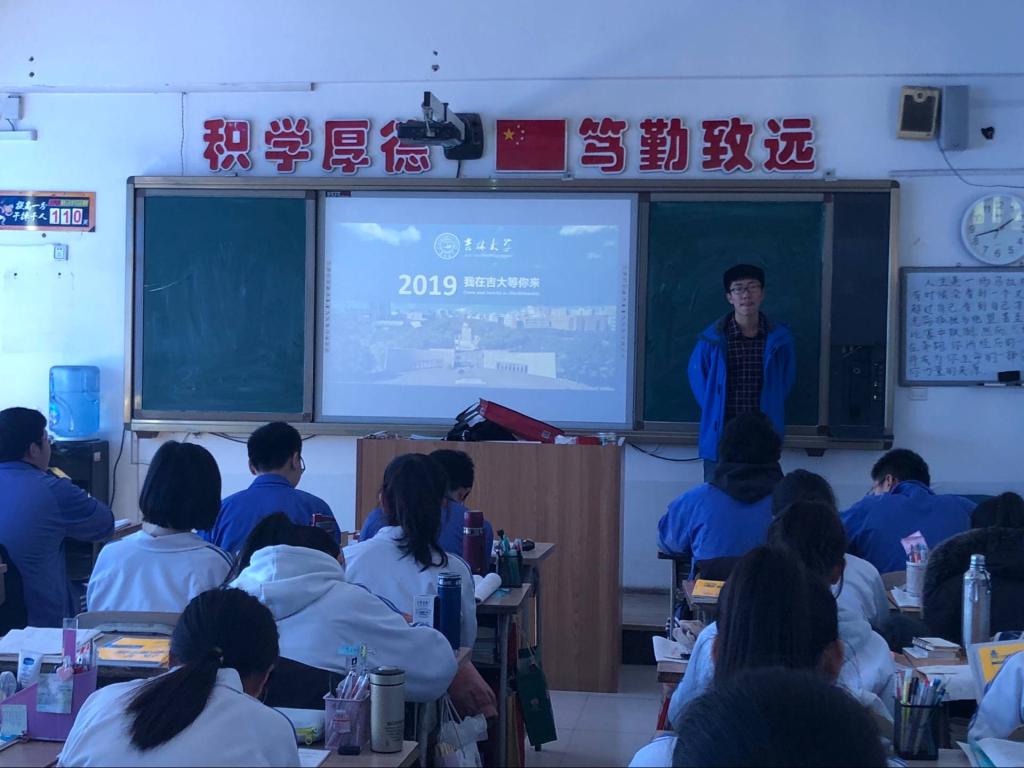 下午1:00,宣讲活动拉开帷幕,本次宣传活动在高三年级理科奥赛班内进行,每一位宣讲人都做了充分的准备。首先,孙宇恒同学对吉林大学做了简单的概括介绍,并和学弟学妹们一起观看了吉林大学的招生宣传片《梦舞吉大》,领略了吉林大学美丽的自然风光。接下来朱昱蒙和赵迪同学对吉林大学的软件与硬件设施、人才培养,以及毕业生的主要去向逐项做了详细的介绍,为那些有意向报考吉林大学的同学提供了丰富的信息资源,也使原本对吉林大学不甚了解的学弟学妹对这所学府产生了向往之情。压轴出场的是乔诗惠和金子越同学,他们为大家介绍了吉林大学的图书馆藏、教学设施、出国留学、就业前景等方面的具体情况,学弟学妹们听的聚精会神,对于吉林大学也有了较为全面的了解,对吉林大学的人文底蕴和校园景色也表现出了向往之情。宣讲期间,宣讲团的成员们还与学弟学妹们进行了互动,解答了他们对于大学生活的一些困惑。活动共持续了一个小时,临别之时,吉大学子向学弟学妹们赠送了吉林大学精美的招生宣传单和书签若干,并预祝他们高考取得理想成绩。